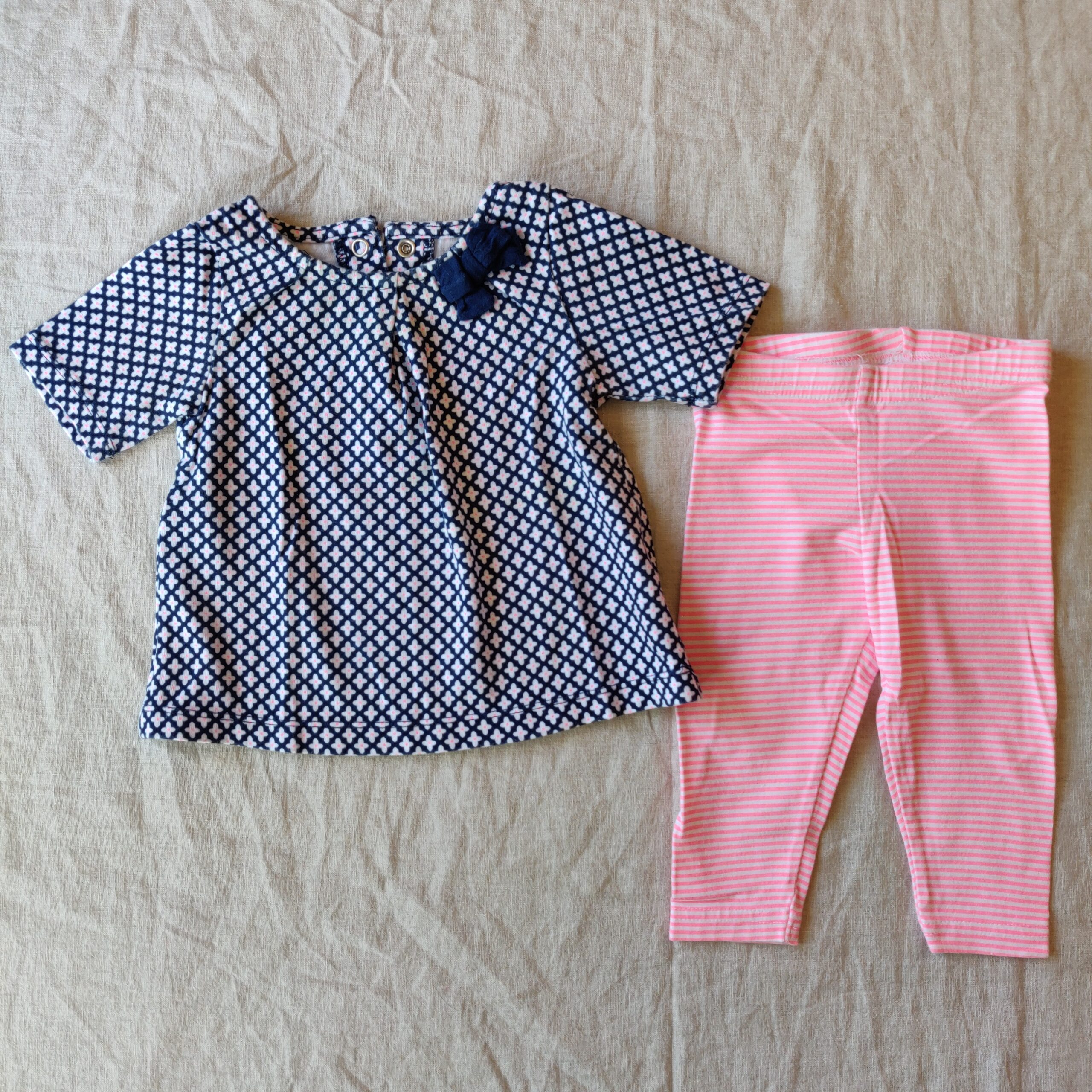 Autres commentaires : Ensembe 2 pièces : leggings rayé rose bonbon et blanc (très légères bouloches d’usure à l’arrière du legging) et tunique manche courte bleue avec motifs fleur et un petit noeud bleu à l’encolure et fermeture par 3 boutons à pression à l’arrière