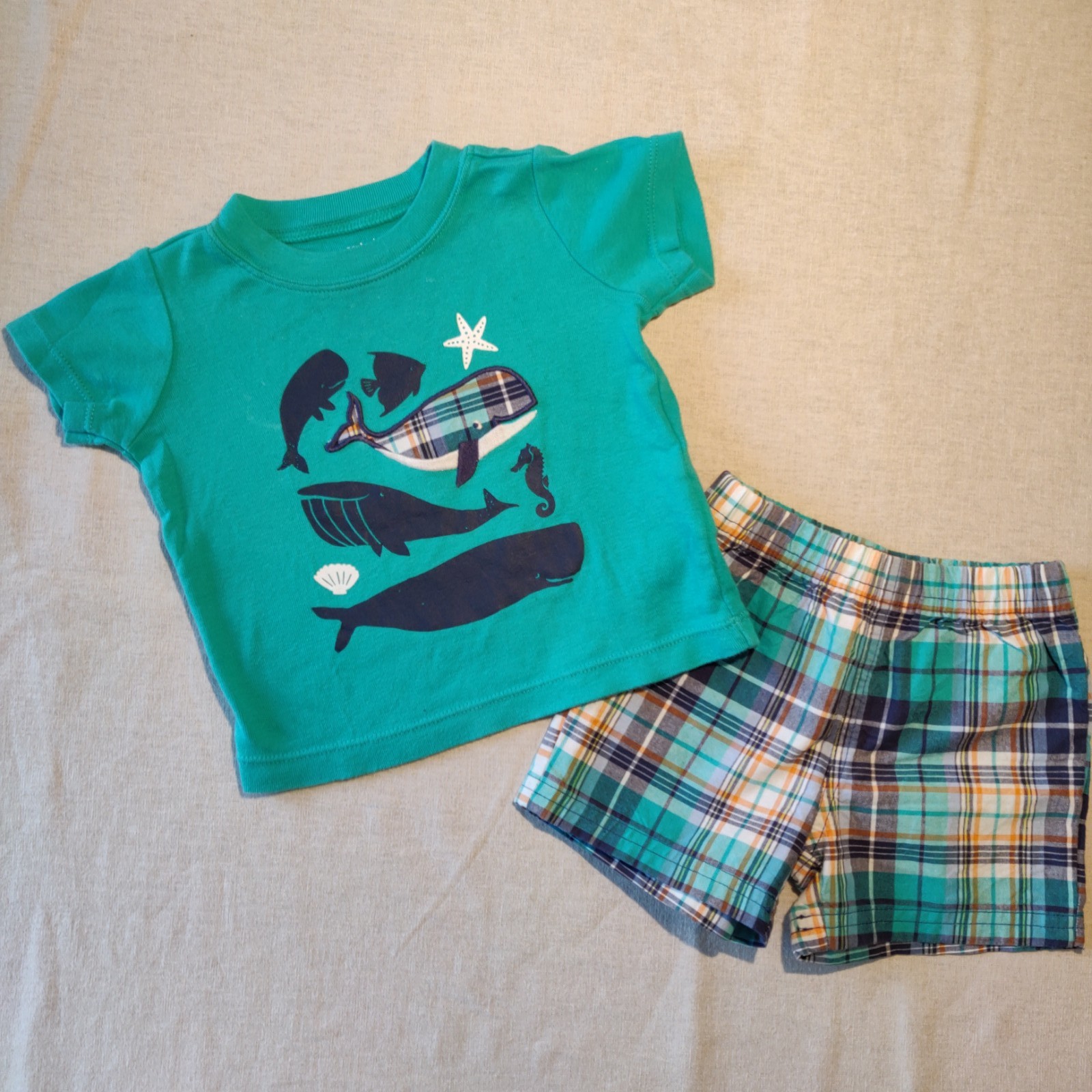 Autres commentaires : Ensemble T-shirt manches courtes vert et short assorti motif écossais. Thème du t-shirt : baleines et étoiles de mer.