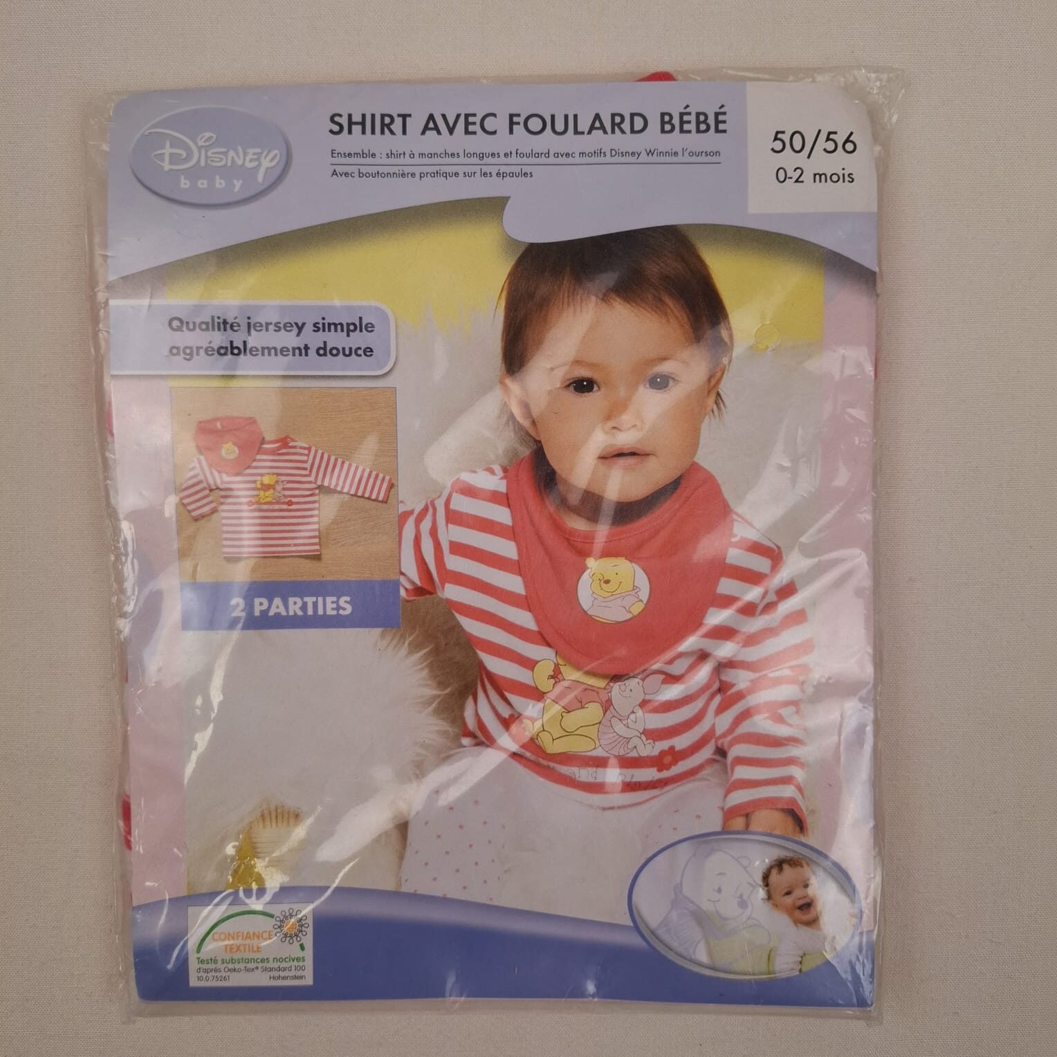 Autres commentaires : Ensemble 2 pièce: – T-shirt manches longues, à rayures blanc et rouge, 2 mois avec une illustration bébé de minnie et d’une peluche à l’avant du vêtement. – Foulard rose avec la tête de winnie à l’avant du foulard