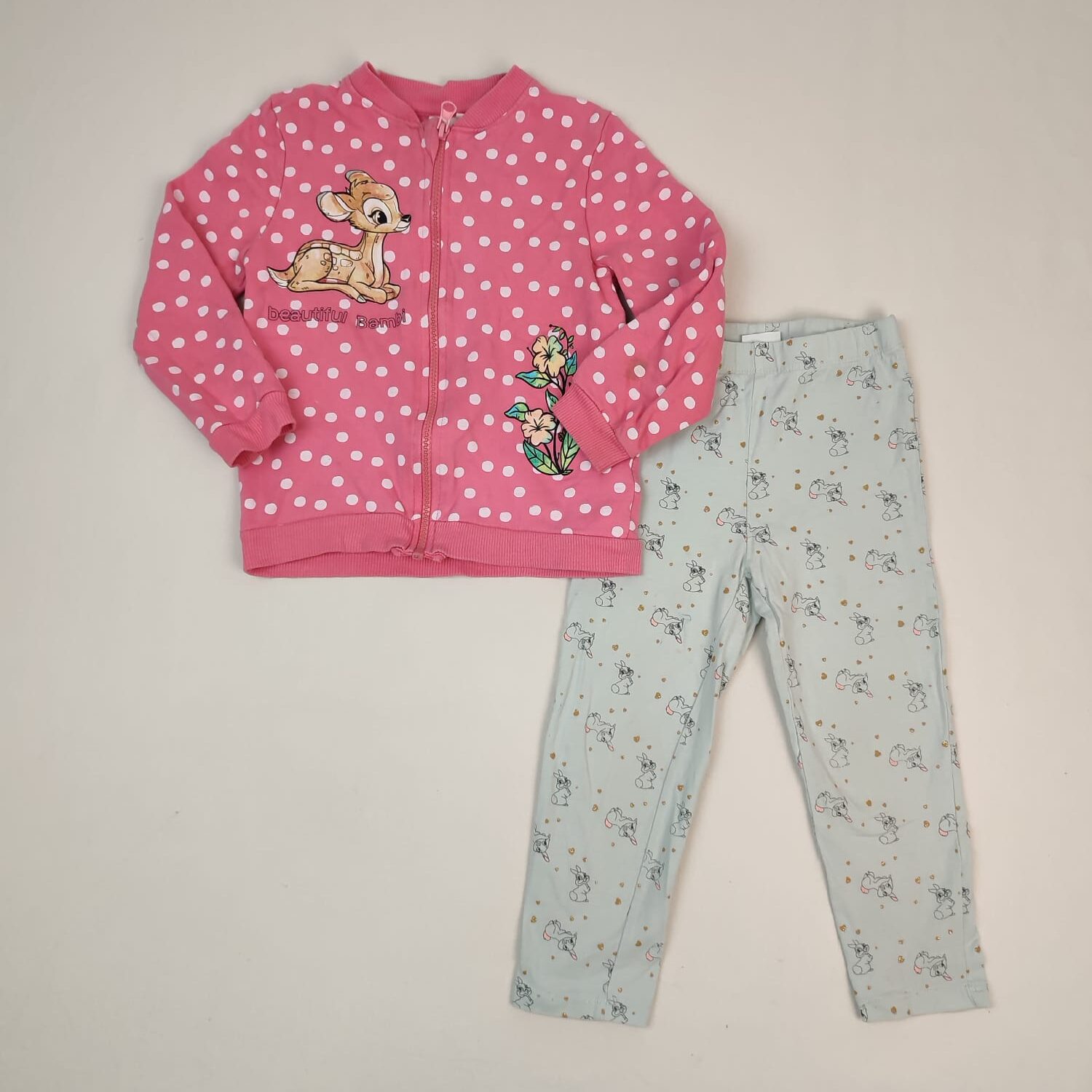 Autres commentaires : Ensemble 2 pièces : – Gilet rose à pois blanches motifs fleurs et Bambi avec l’inscription « Beautiful Bambi ». – Pantalon vert très pâle, motifs mini lapins Pan-Pan.