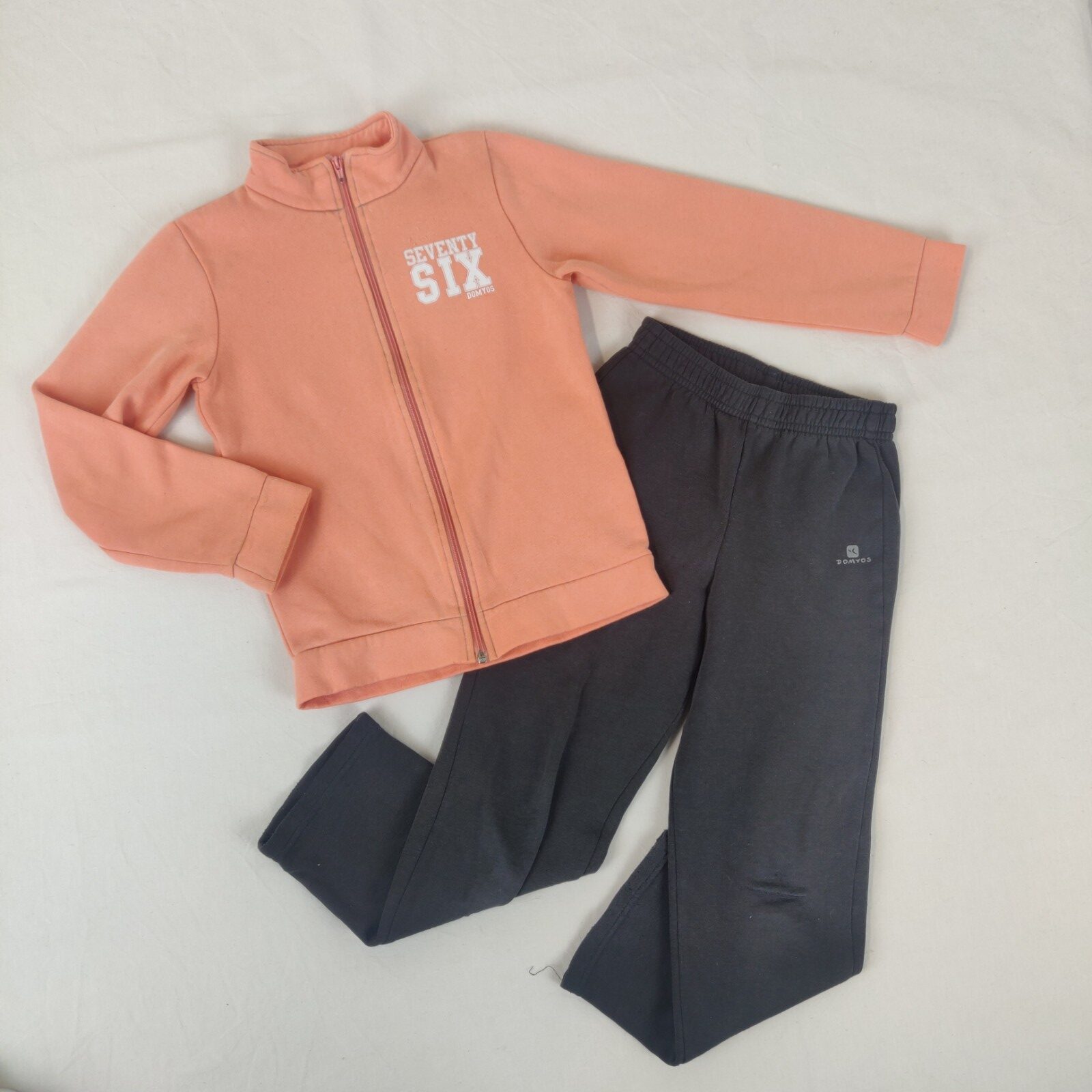 Autres commentaires : Ensemble 2 pièces. Un gilet – saumon. Inscription centrale blanche « Seventy Six Domyos ». Ouverture centrale zippée. Quelques tâches discrètes au dos. Un pantalon de jogging – gris foncé. Taille élastique. Niveau réduit de fraise à myrtille.