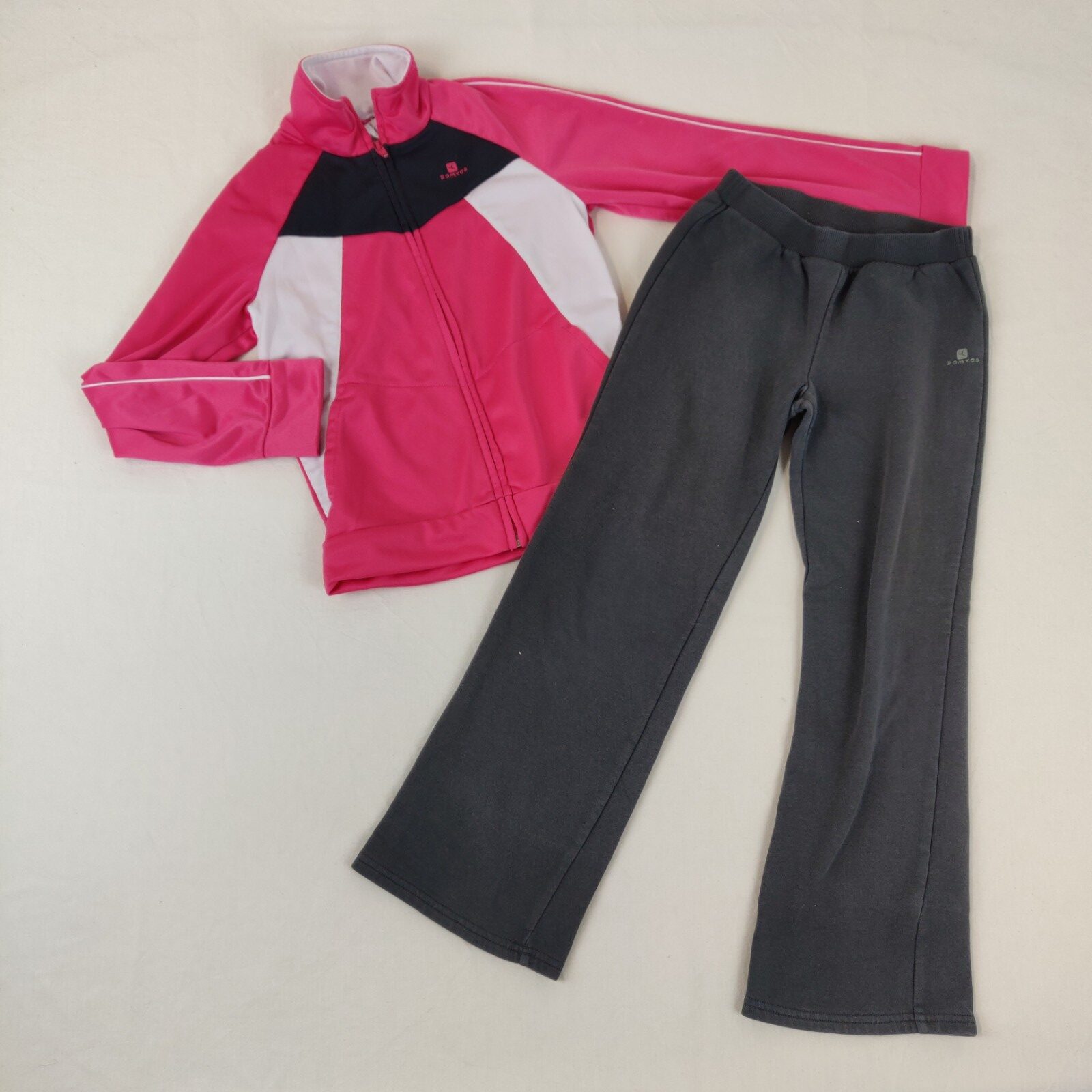 Autres commentaires : Ensemble 2 pièces. Une veste rose, grise et blanche. Ouverture centrale zippée. 2 poches latérales. Usure normale. Un pantalon de jogging gris foncé. Taille élastique.