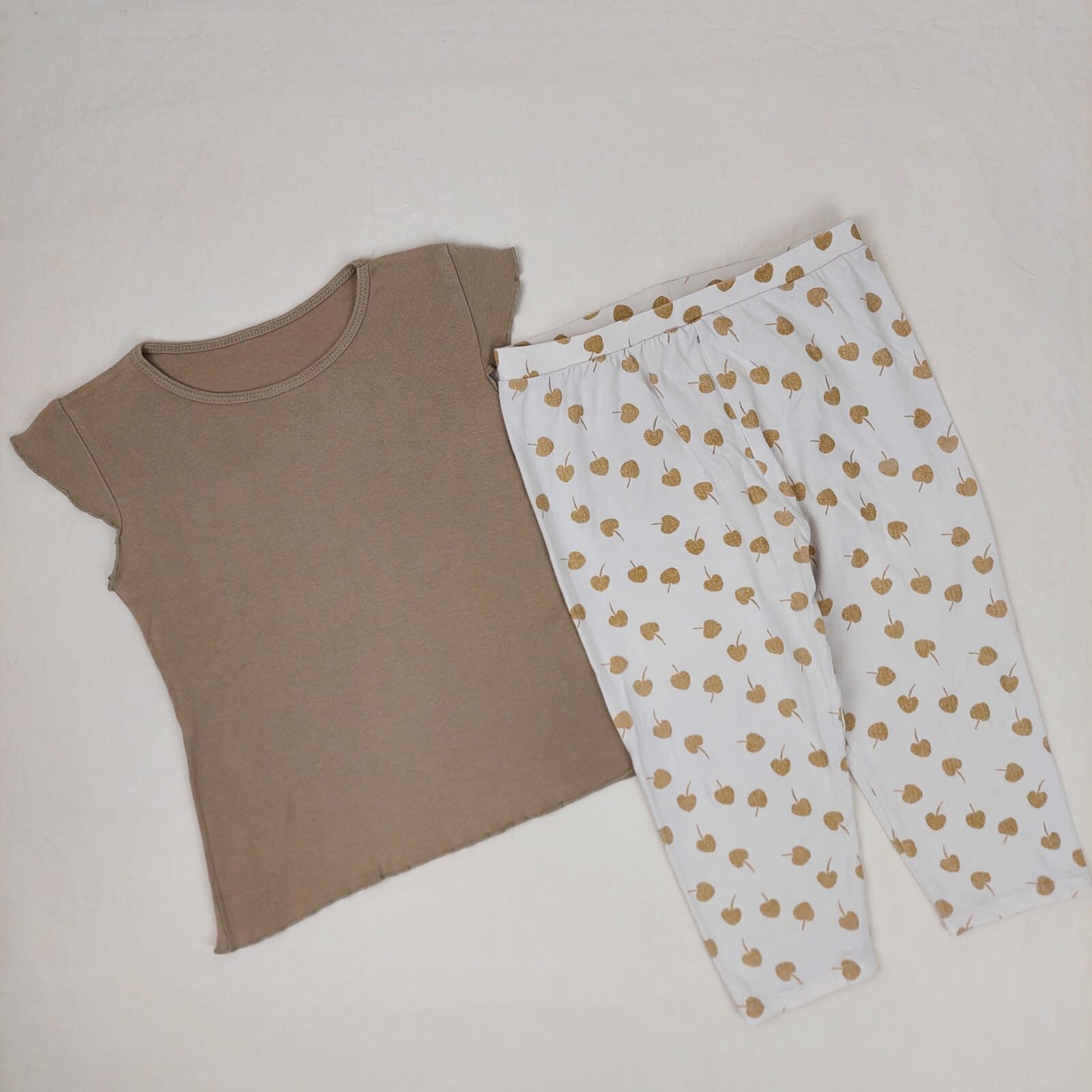 Autres commentaires : Ensemble de deux pièces : Pantalon blanc Du Pareil au meme,imprimé des pommes Gold, une tache à l’avant T-shirt manches courtes marron