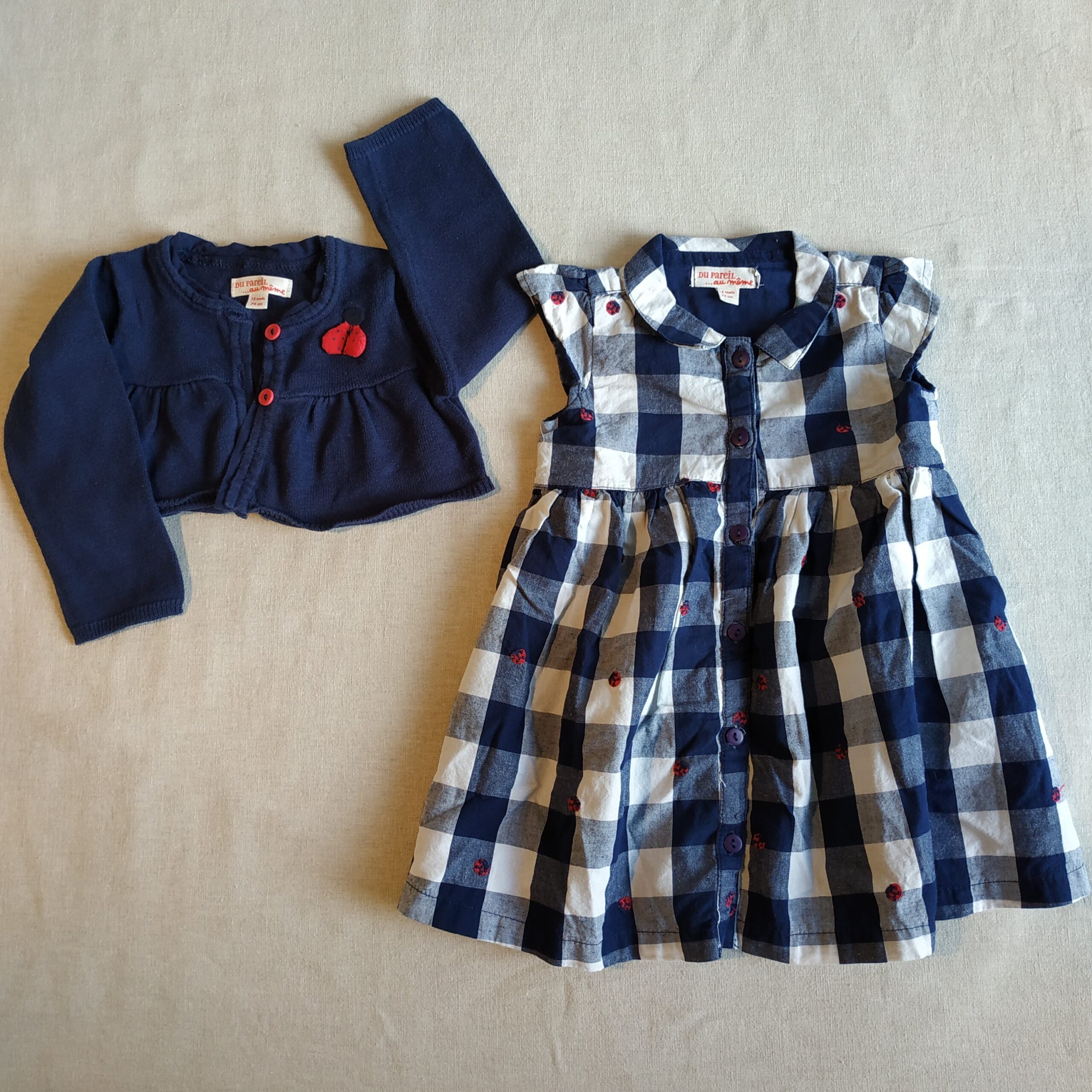 Autres commentaires : Robe manches courtes à petit col, à carreaux bleu marine et blanc et petites coccinelles rose fuchsia brodées. Fermeture par boutons tout le long de la robe à l’avant. Boléro assorti bleu marine fermé par deux boutons rose fuchsia et motif coccinelle brodée.