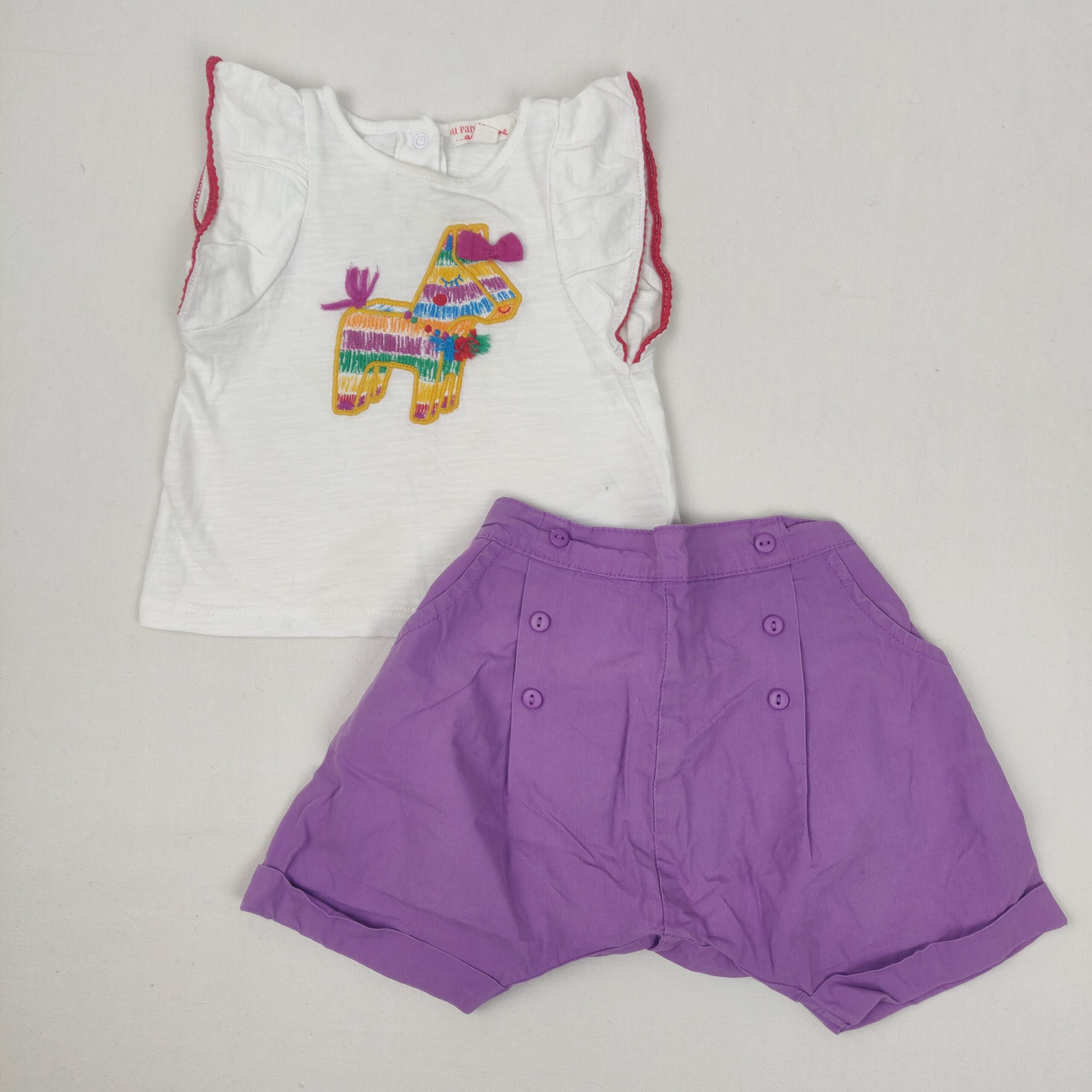 Autres commentaires : Ensemble 2 pièces DPAM dont un short violet avec taille semi-élastiquée dans le dos, devant des boutons décoratifs forment un style double pont, bas des jambes avec revers et un t-shirt blanc en jersey, à manches très courtes voalntées avec liseré dentelé rouge, motif devant de pinata multicolore avec queue et noeud en relief violets, fermeture par boutons pression en haut du dos.