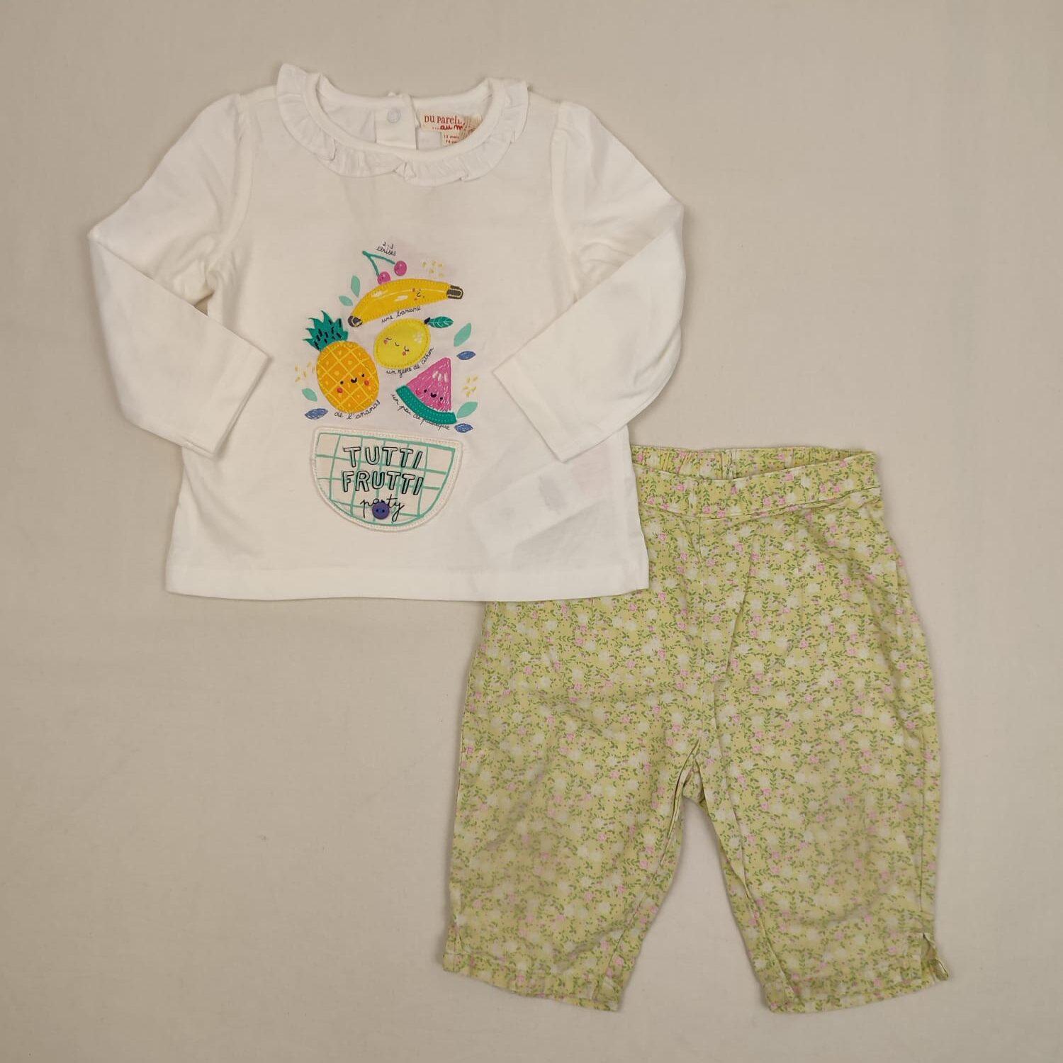 Autres commentaires : Ensemble 2 pièces : – T-shirt blanc à manches longues DPAM, motif fruits et inscription « Tutti frutti », fermeture par bouton pression au dos, col collerette, neuf étiiqueté. – Pantalon léger vert printanier, motif floral, sans marque, taille élastiquée au dos.
