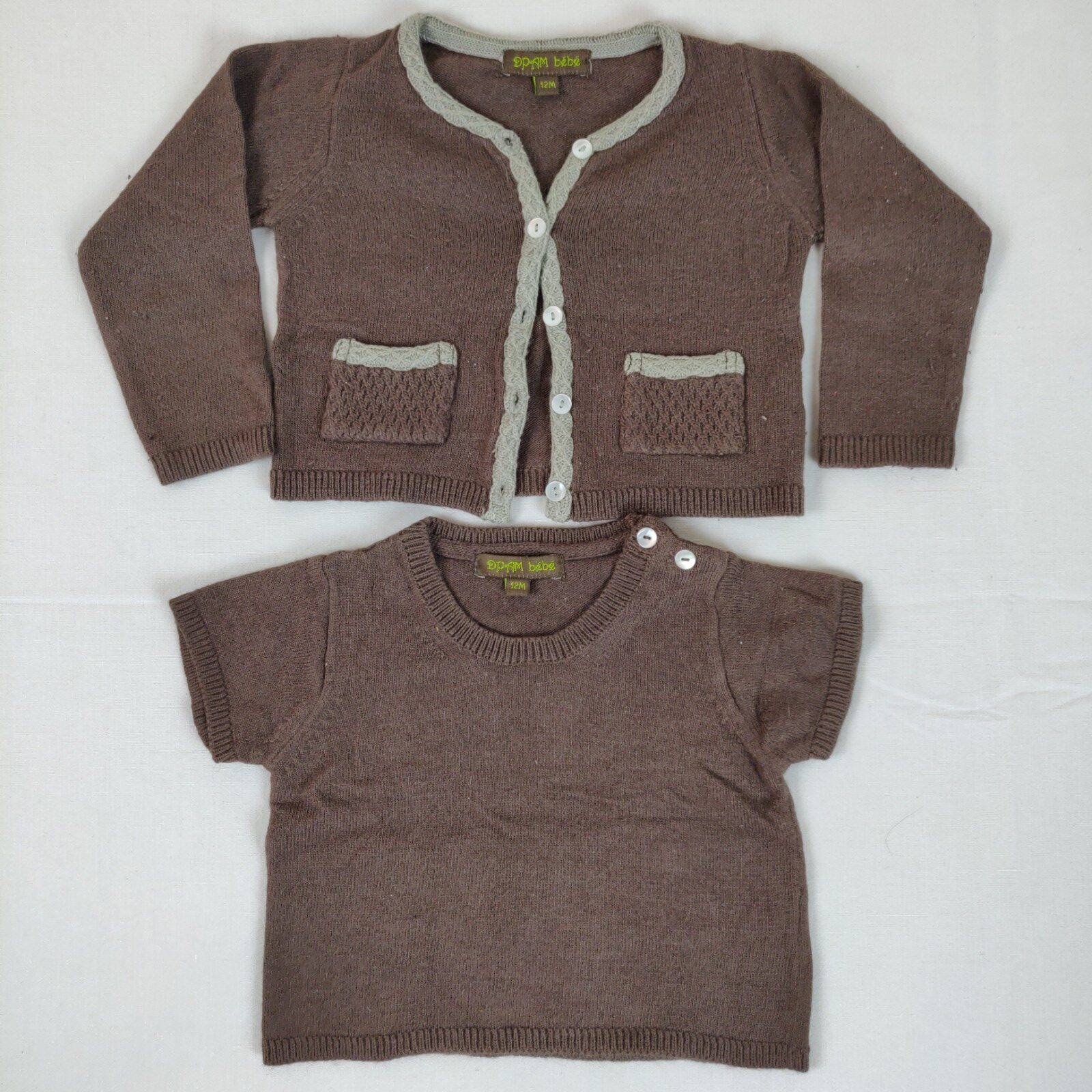 Autres commentaires : 25% acrylique, 20% nylon, 20% viscose, 10% laine. Ensemble 2 pièces twin set. Gilet – marron. Ouverture centrale à fermeture éclair à 5 boutons classiques nacrés (1 bouton supplémentaire fourni). 2 poches latérales en mailles losanges. Le col, l’ouverture et le rebord des poches sont en mailles torsadées grises. T-shirt à manches courtes assorti. Ouverture latérale à 2 boutons classiques nacrés. Quelques bouloches d’usage liées à l’angora.