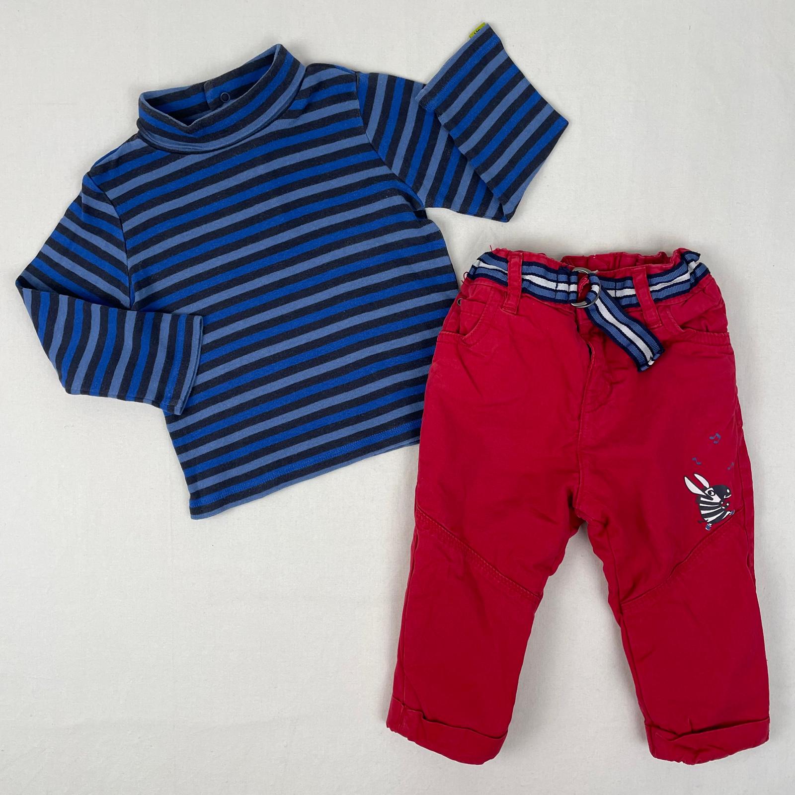 Ensemble 2 pièces : – T-shirt à col roulé, à rayures noires et bleues ; – Pantalon rouge, taille élastique réglable, doublure molleton, motif zèbre à l’avant, 2 poches devant et derrière.