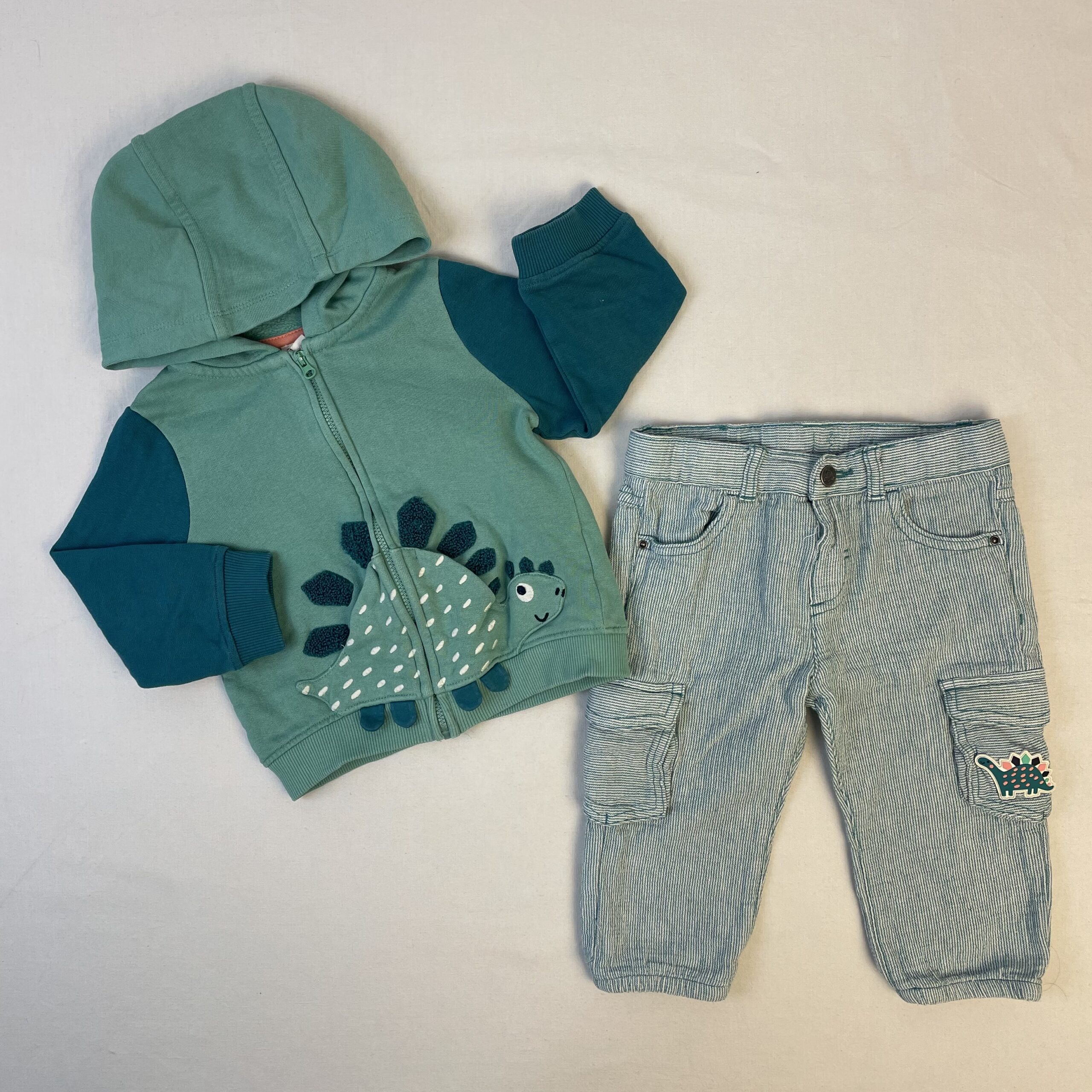 - Gilet à capuche, zip centrale, doublure molleton, motif dinosaure.