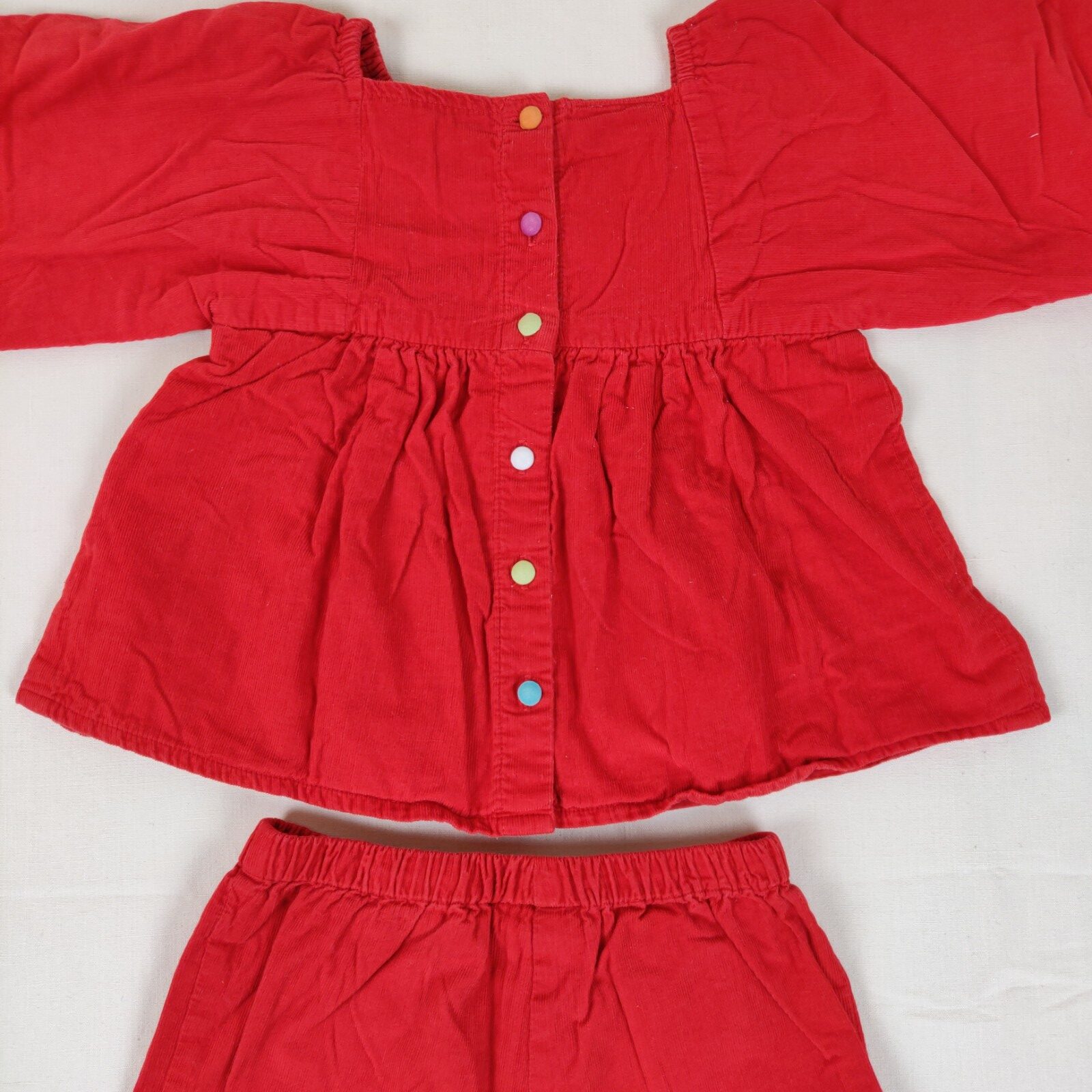 Autres commentaires : Ensemble en velours finement côtelé rouge. Blouse à manches longues avec pour la partie centrale de mutiples petits miroirs colorés. Ouverture au dos à boutons multicolores recouverts de tissu. Pantalon assorti. Taille élastique. Petits miroirs parsemés le long des jambes. Liserés verts géométriques aux chevilles.