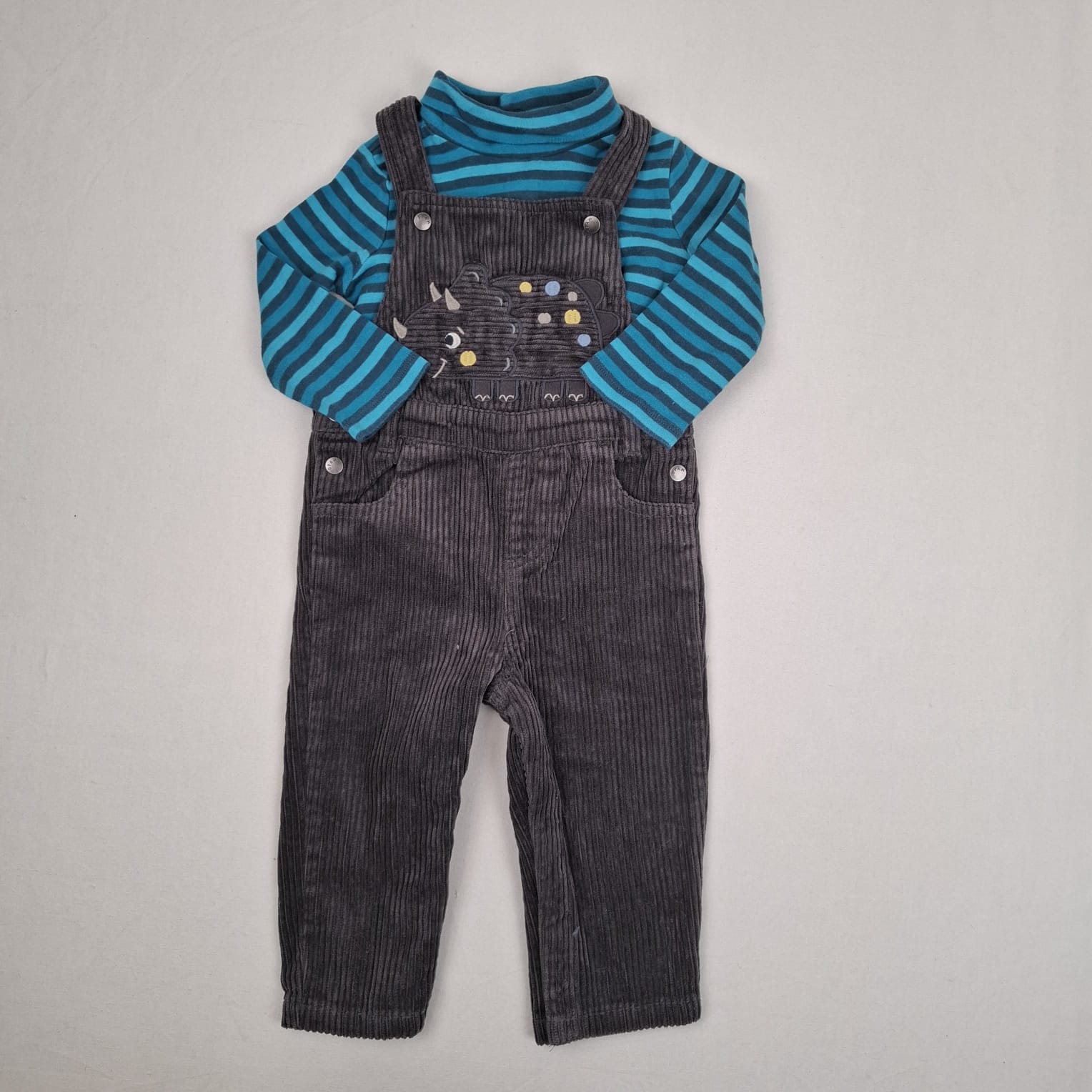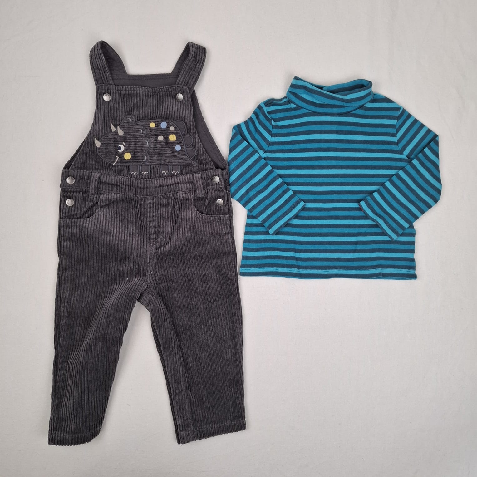 Autres commentaires : Ensemble 2 pièces 18M DPAM composé d’un T-shirt col roulés manches longues rayés avec différents teintes de bleu et d’un salopette grise façon velours avec broderie rinocéros fermeture boutons pression sur les bretelles