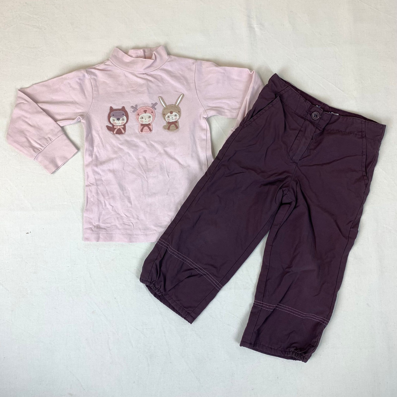 Autres commentaires : T-shirt manches longues rose col roulé avec 3 petits chats en motif. Pantalon violet en taille elastiquée et sur le bas.