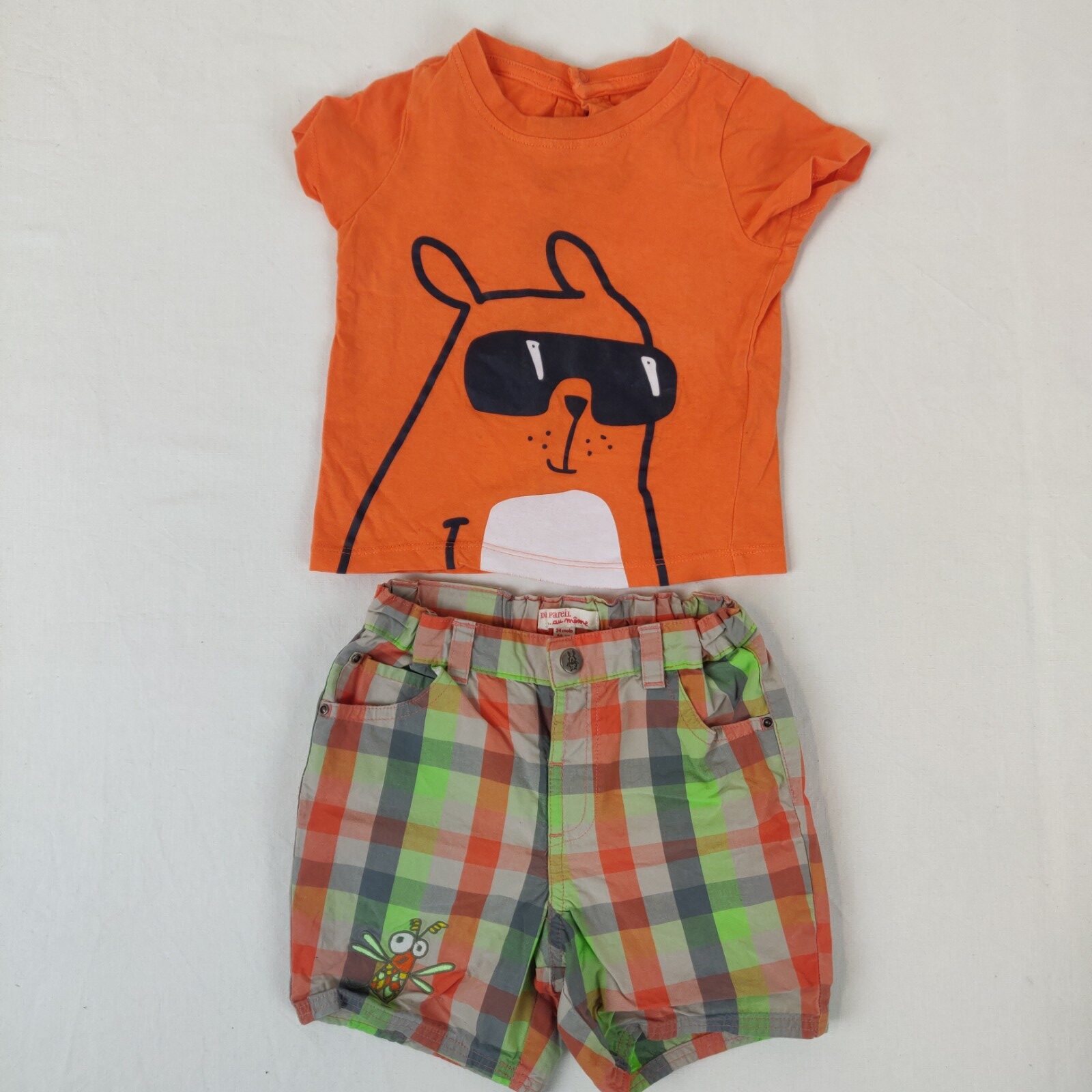 Autres commentaires : Ensemble 2 pièces. Un t-shirt à manches courtes – orange. Motif central chien avec des lunettes de soleil. Ouverture centrale au dos à 3 pressions. Un bermuda à carreaux oranges, verts, gris et beiges. Taille ajustable. 2 poches latérales et 2 poches arrières. Motif latéral brodé insecte rigolo. Passants pour une ceinture.