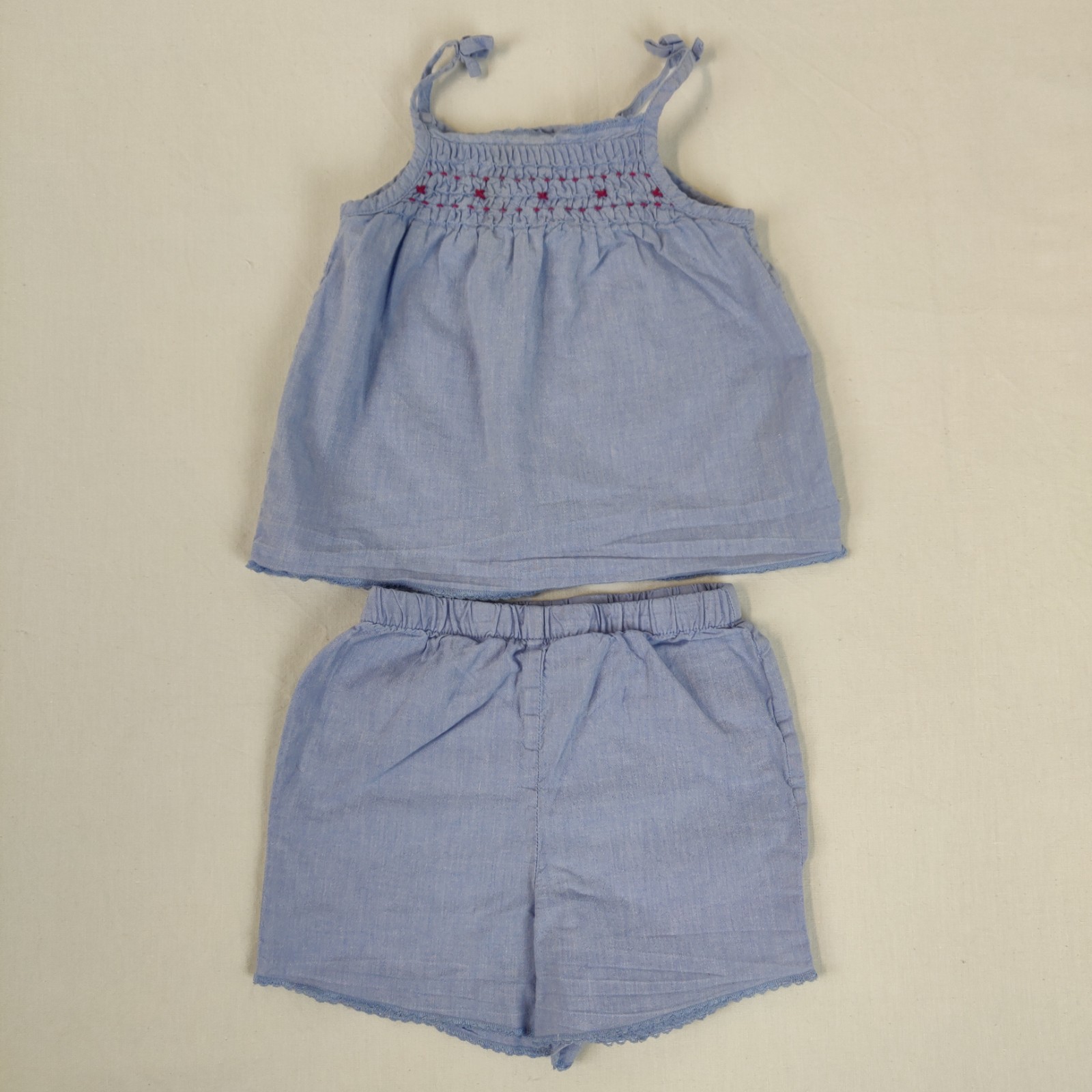Autres commentaires : Ensemble 2 pièces assorties – bleu clair composée de : un débardeur à fines bretelles avec effet smocké de la partie supérieure. Fine broderie bleue en bordure de la taille. Ouverture centrale tout le long du dos à boutons. Un short – taille élastique. Fine broderie bleue au niveau de l’ouverture des jambes. Usure normale.