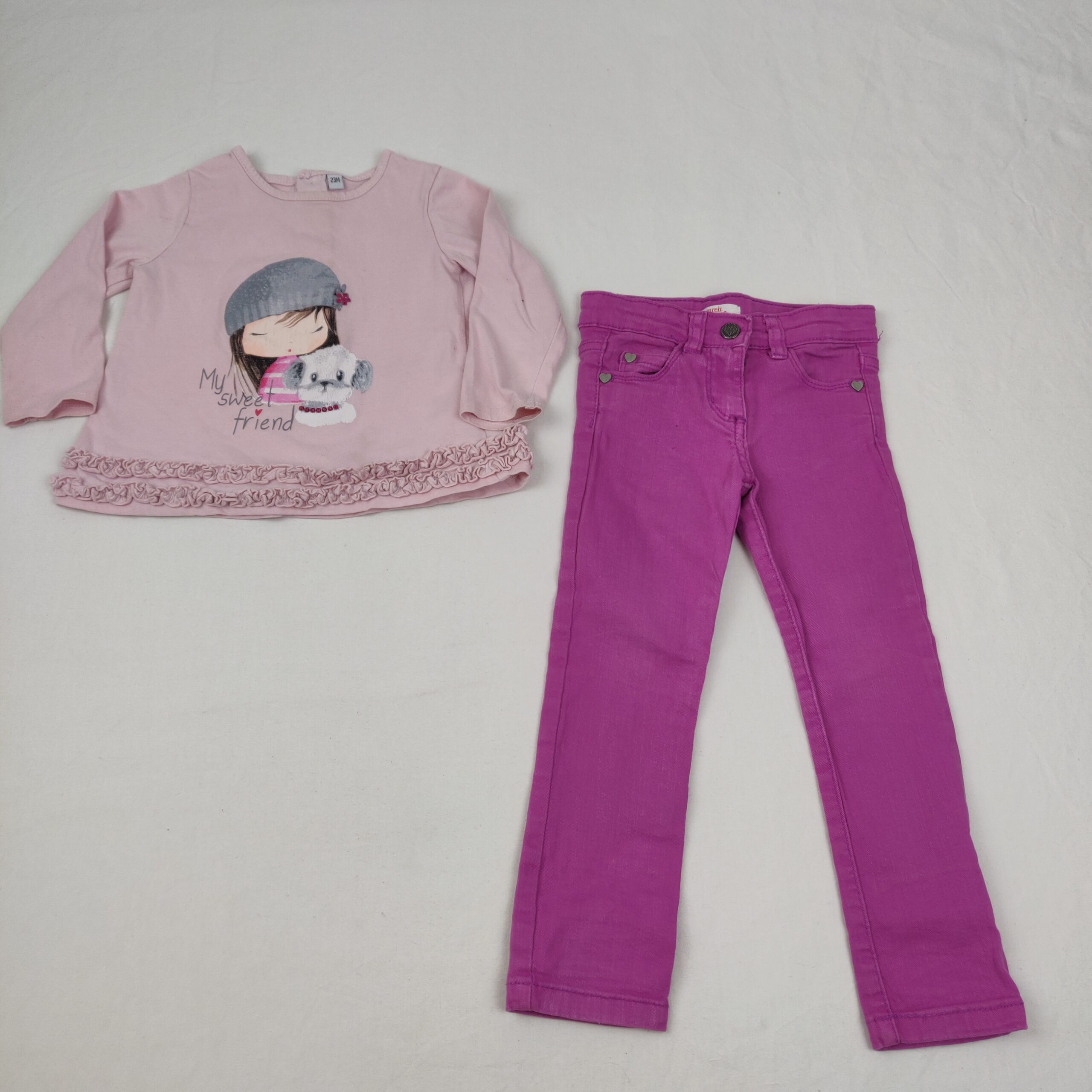Autres commentaires : Ensemble 2 pièces dont – 1 pantalon jeans rose fushia DPAM, fermeture par zip et bouton pression, taille ajustable (légère auréole derrière) – 1 T-shirt rose pâle manches longues, col rond, ouverture boutons classiques en haut du dos, motif central petite fille avec chien et inscription en gris « My sweat friend » (60% coton, 40% polyester), sans marque légères bouloches d’usage – niveau réduit de Fraise à Myrtille