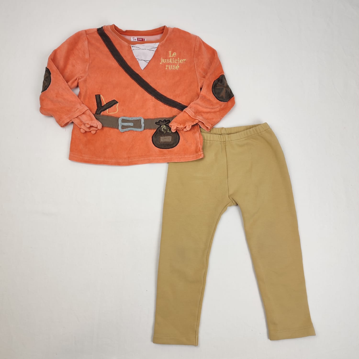 Autres commentaires : Ensemble 2 pièces : T-shirt manches longues en velours 76% coton, 24% polyester, col rond, au dos motif arbaléte et devant effet tunique moyen-âge avec ceinturon, bourse et lance-pierre avec inscription « Le jsuticier rusé ». Pantalon beige jaune Uniqlo, 52% polyester, 42% coton, 6% élasthanne, intrérieur en poyester, taille élastiquée.