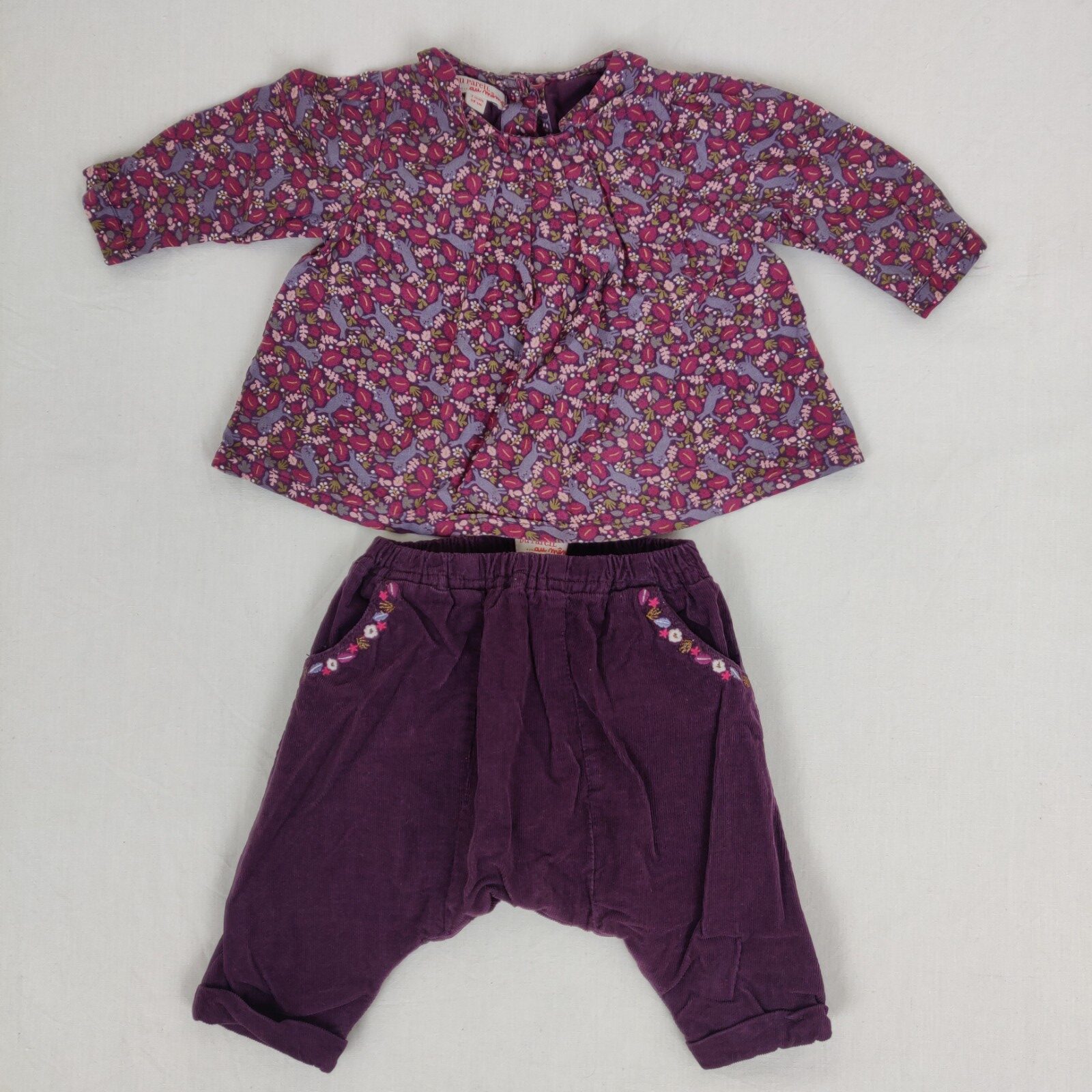 Autres commentaires : T-shirt violet manches longues fleuri en col claudine avec une fermeture par boutons au dos. Pantalon violet en taille élastiquée.