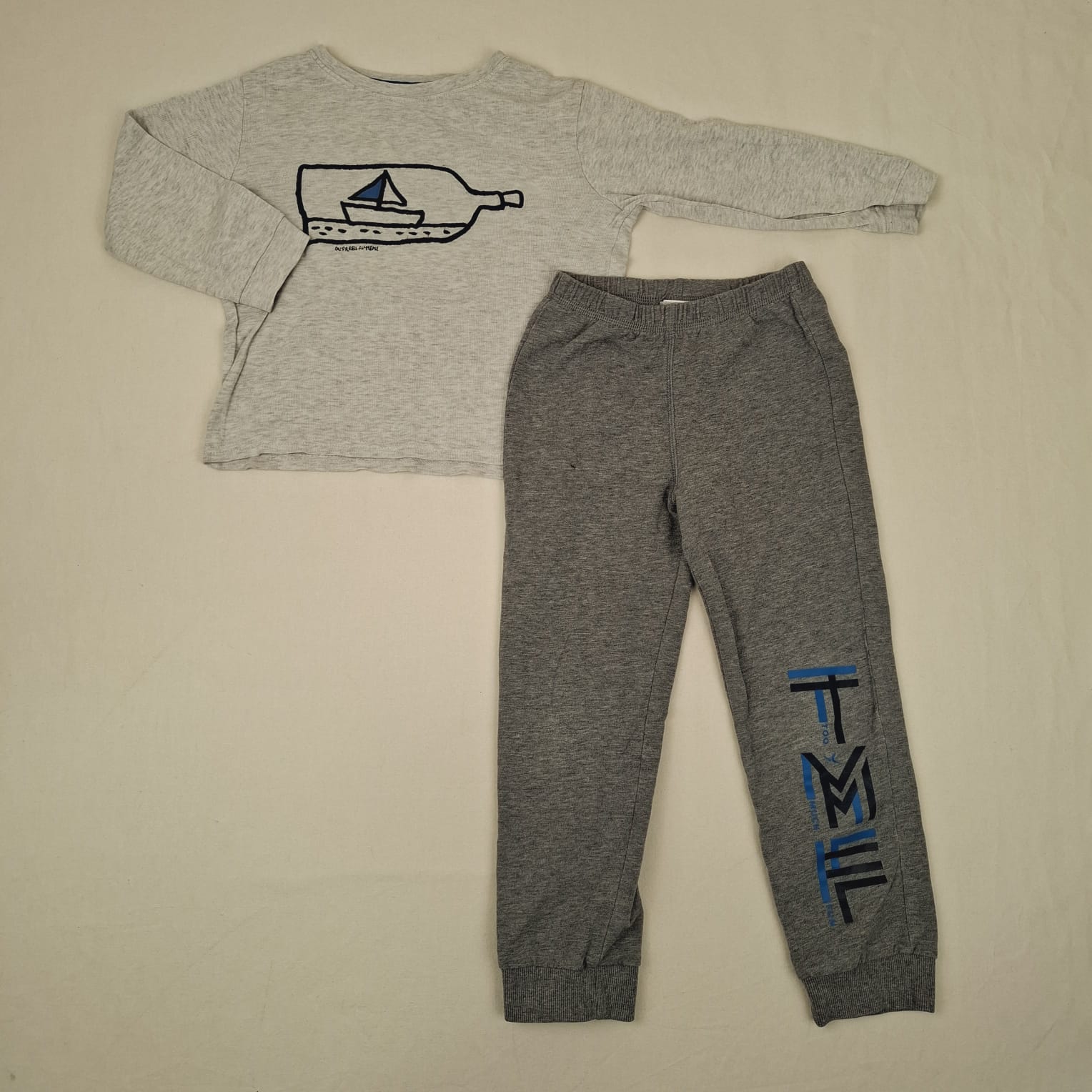 Autres commentaires : Ensemble 2 pièces: – T-shirt côte gris uni à manches longues, bateau dans une bouteille, 98% coton, 2% viscose. – Pantalon de jogging en molleton gris, taille élastiquée, inscription « T too M much F fun ».
