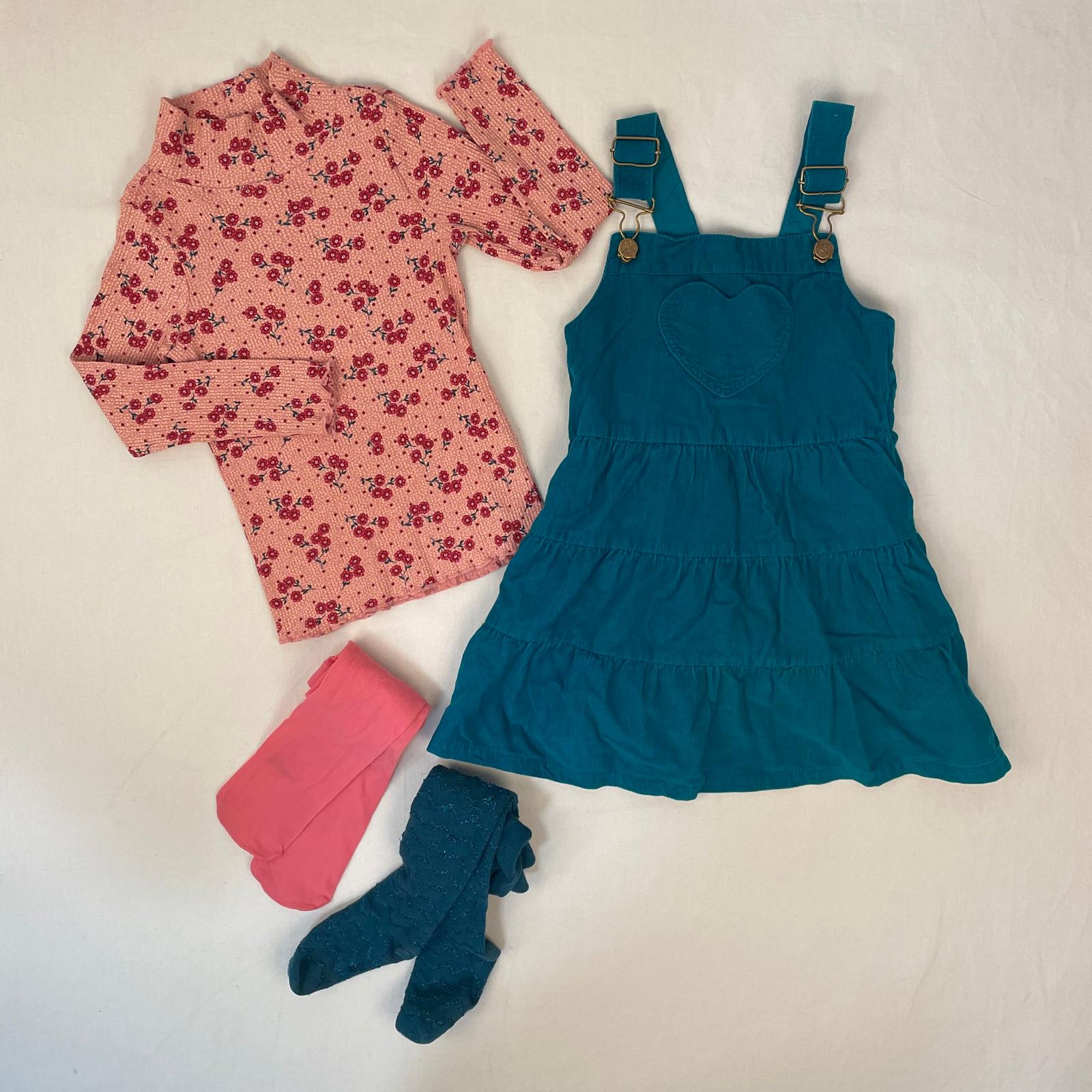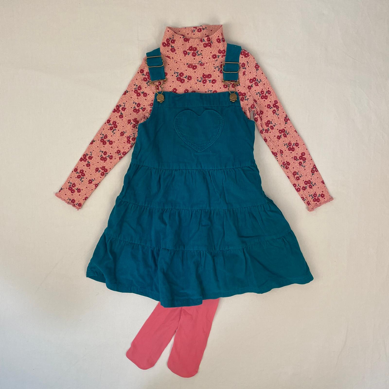 • Robe en velours côtelé vert canard, à bretelles réglables de type salopette, à volants, élastiquée sur les côtés.