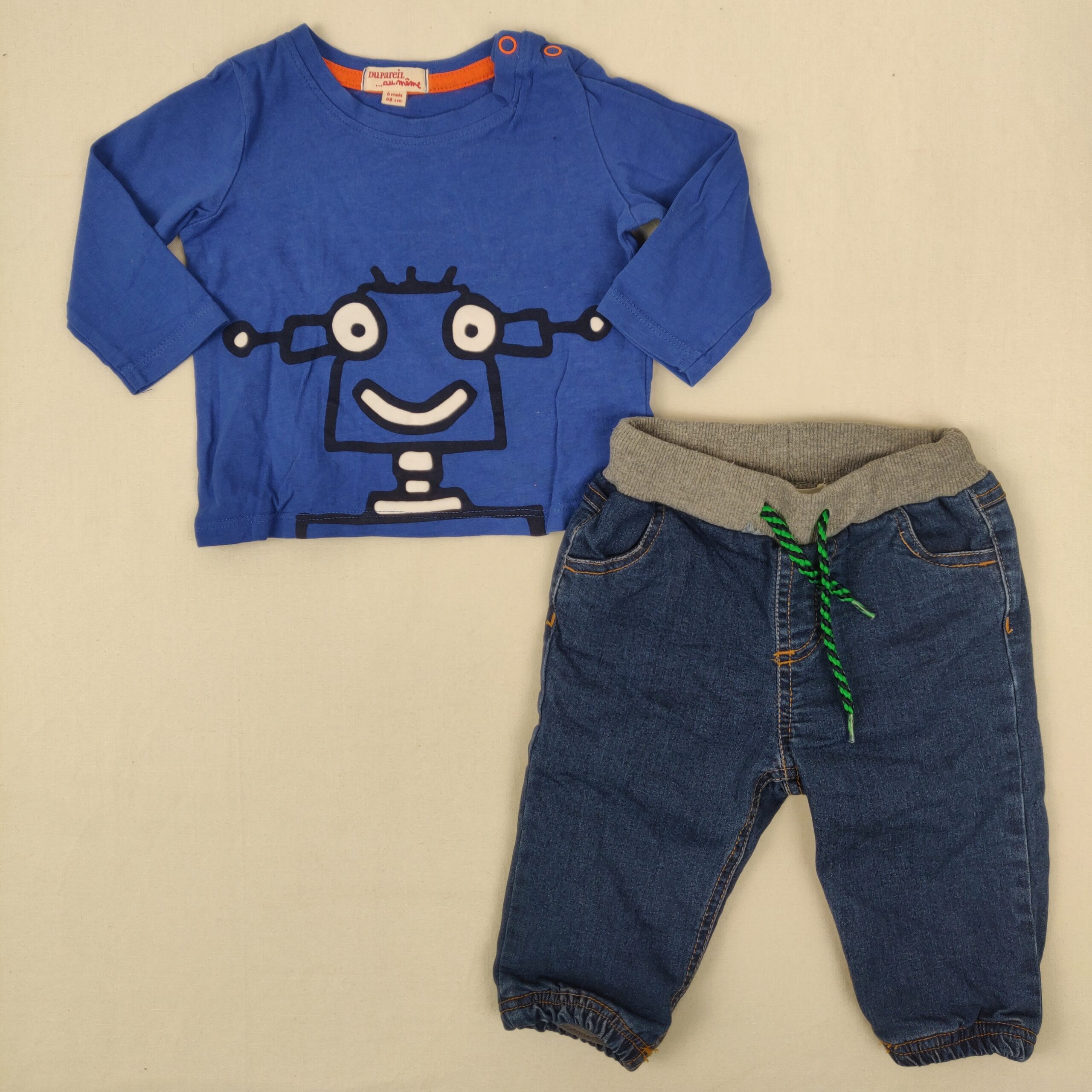 Autres commentaires : Ensemble enfant comprenant un t-shirt bleu en coton 100 % avec motif imprimé, assorti à un jean doublé d’une matière polaire douce à l’intérieur (66 % coton, 33 % polyester, 1 % élasthanne).