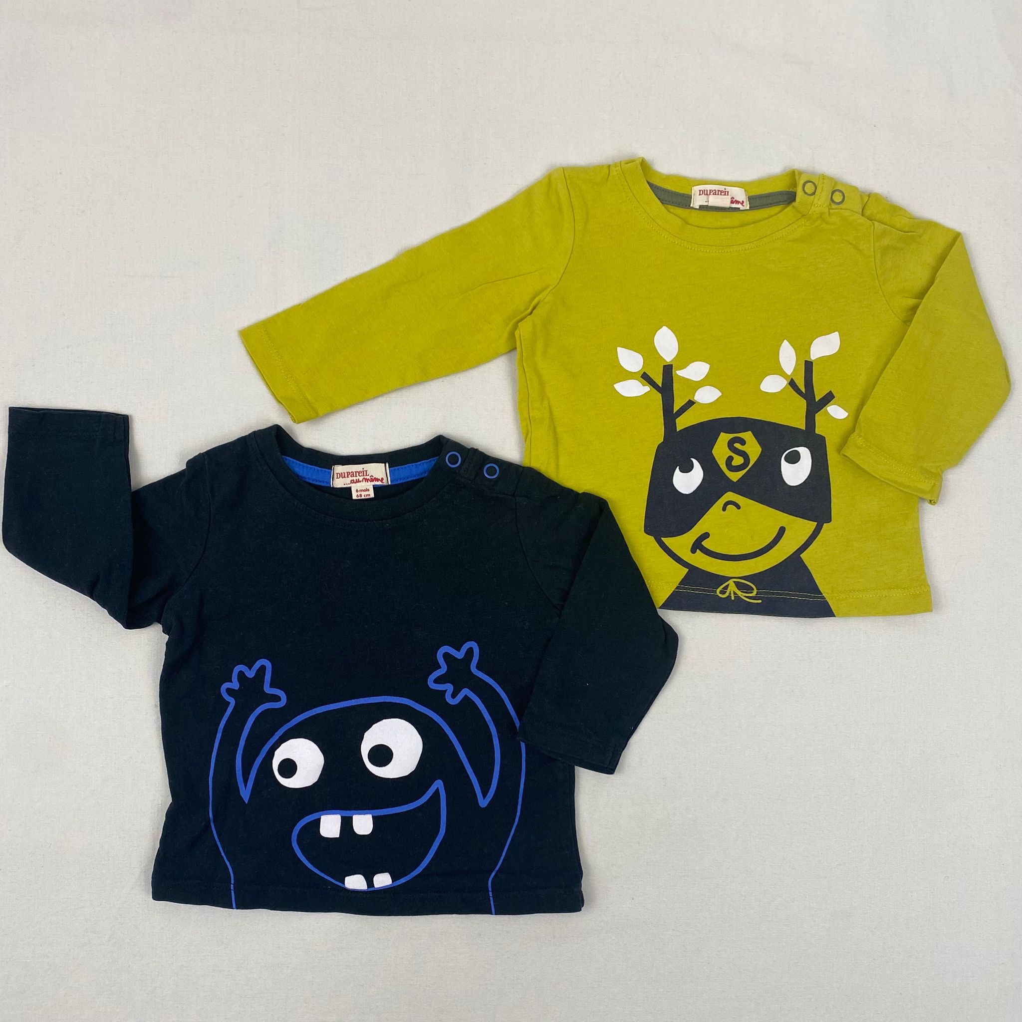 Autres commentaires : Lot de 2 t-shirts manches longues, l’un noir et l’autre vert, avec dessins de bonhomme, fermeture par boutons pression à l’épaule gauche.