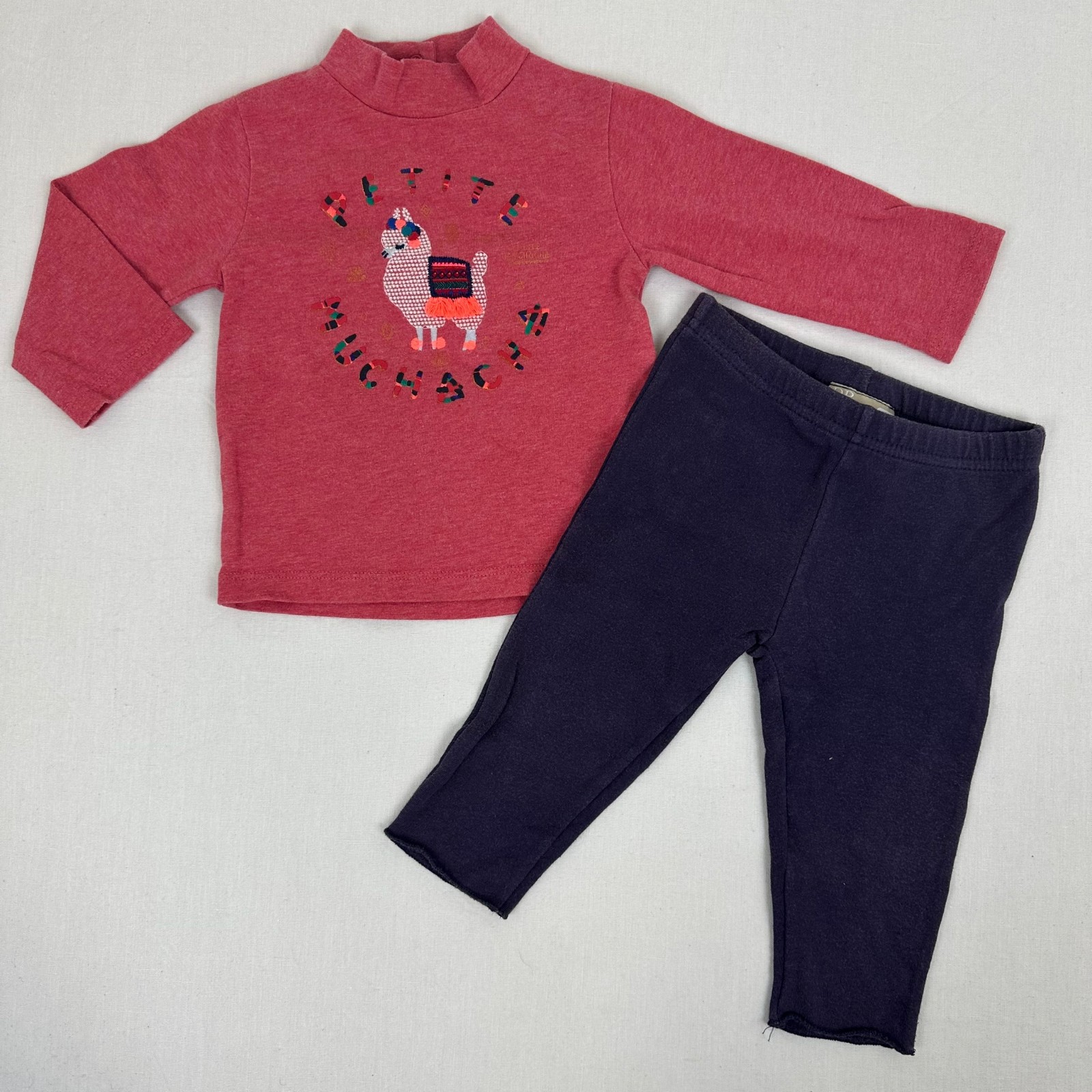 Autres commentaires : 29 % polyester et 4% elasthanne. T-shirt manches longues rose avec une fermeture par boutons pressions au dos et comme motif une chévre « petite muchacha ». Legging violet taille élastiquée.