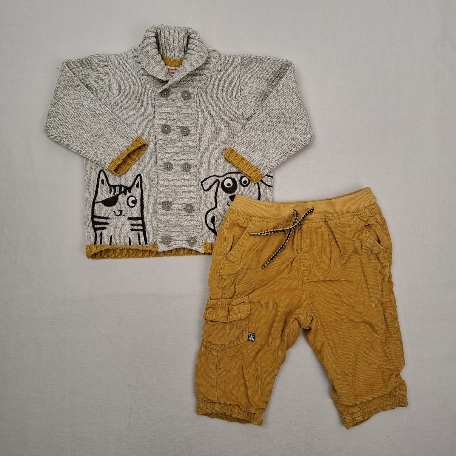 Autres commentaires : Ensemble 2 pièces: – Gilet tricoté beige, motif chat et chien, fermeture boutons, col châle, finition bord-côte jaune à la base et en bas de manche. – Pantalon en velours jaune, taille élastique avec cordon, doublure en coton, bas élastique.
