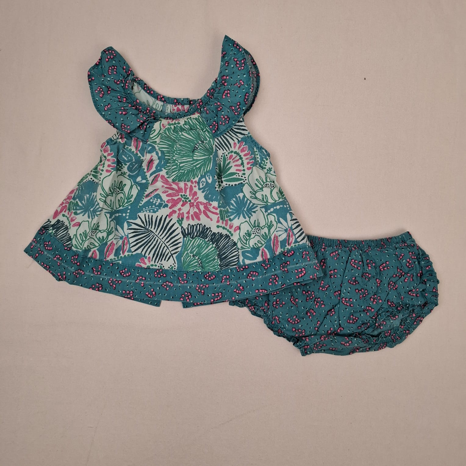 Autres commentaires : Ensemble 2 pièces: – Blouse évasée turquoise à manches volantées et sa base en imprimé contrasté, motif tropical frais et coloré, entièrement boutonnée au dos. – Bloomer assorti, taille élastique, froufrous au dos.