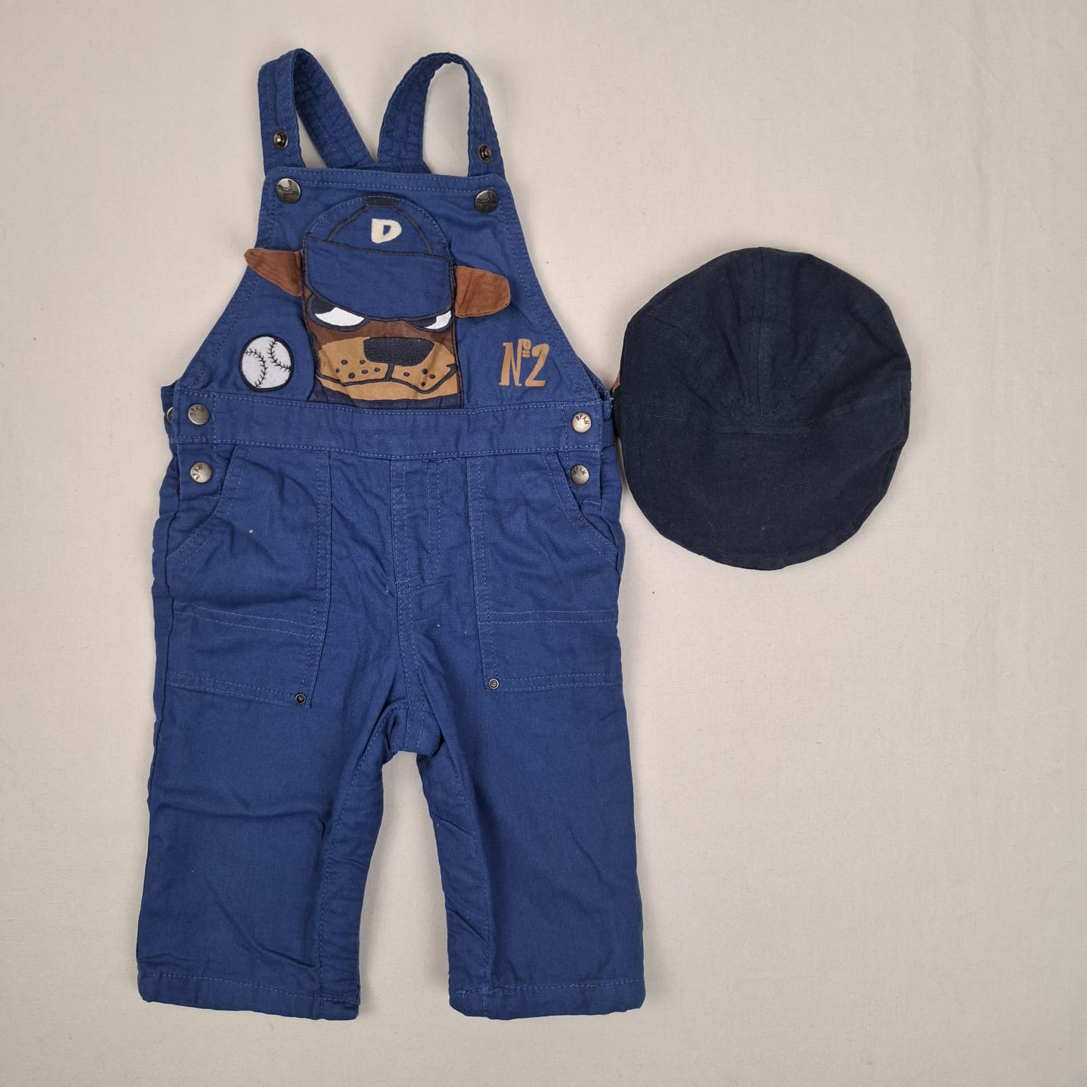 Autres commentaires : Ensemble 2 pièce: -Salopette bleu motif chien fantaisie avec oreilles en relief sur le plastron, fermeture par boutons pression sur les côtés et à l’entrejambe., 2 grandes poches italiennes sur le devant, bretelles en Y au dos à réglables par 2 boutons pression, surpiqûres ton sur ton, doublure en coton. -Casquette marine, élastque au dos.