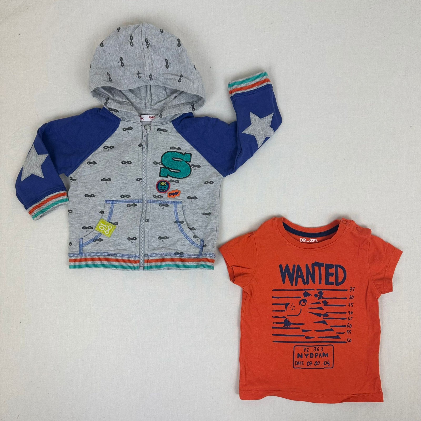 Autres commentaires : T-shirt manches courtes avec motif Wanted et une fermeture avec boutons pressions à l’épaule. Gilet gris manches longues bleu avec capuche et une fermeture en zip.