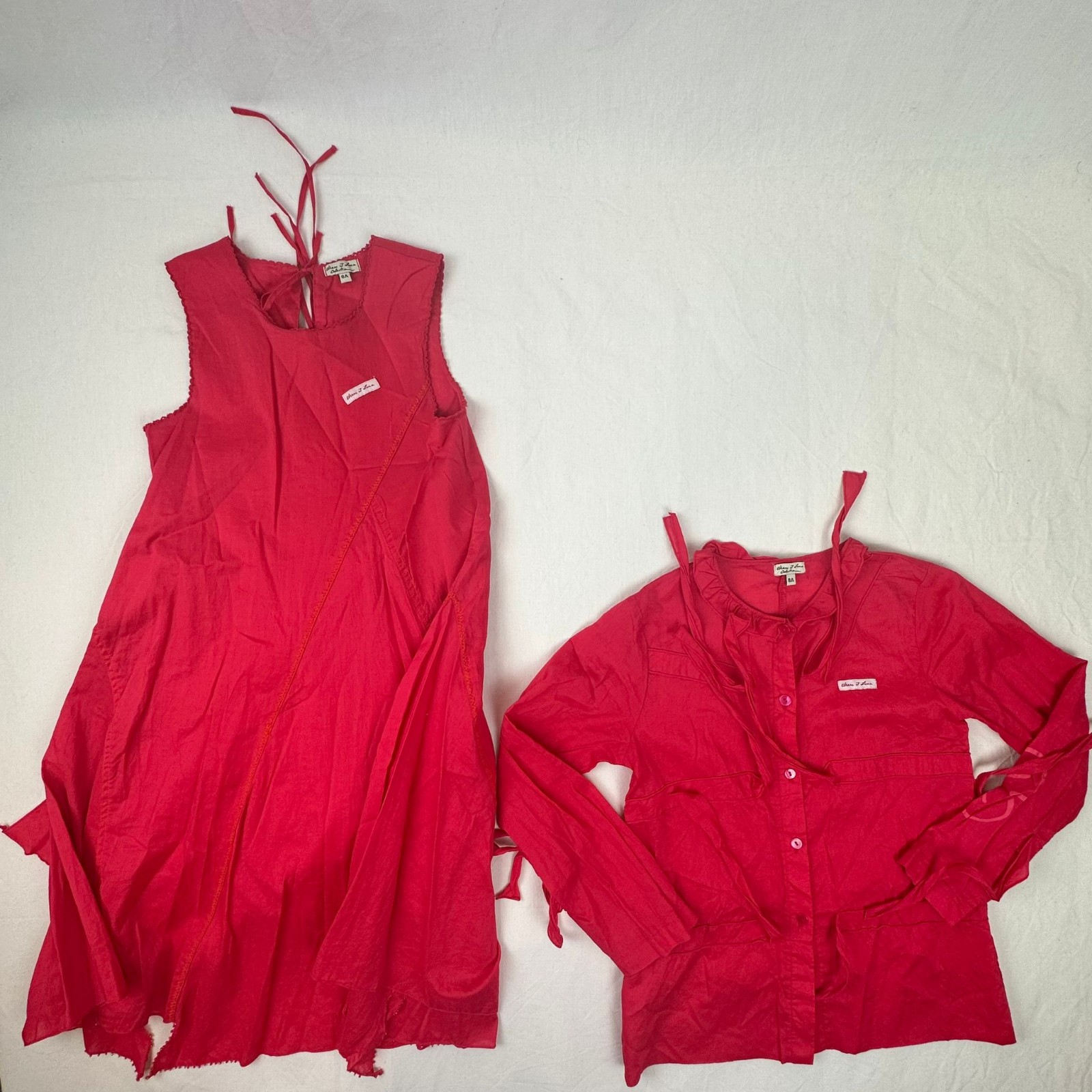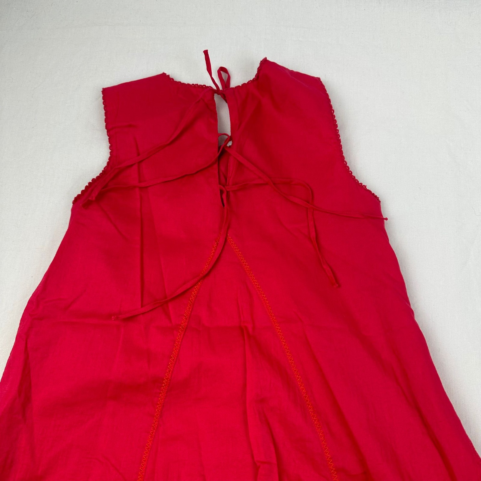 Autres commentaires : Robe 3/4 sans manches rose légére avec doublure et une fermeture au dos par lacets. Gilet manches longues rose avec une fermeture devant par boutons et comme motif des petits lacets tombant.