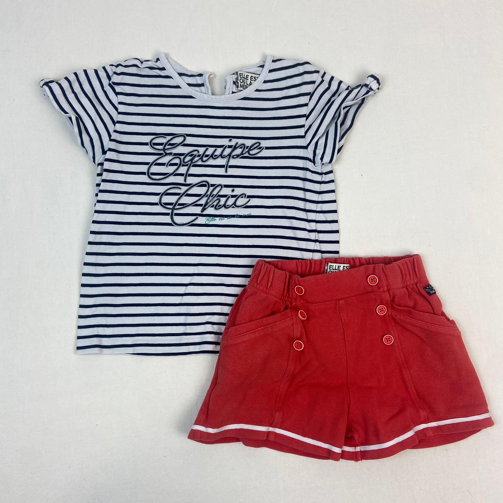 Autres commentaires : T-shirt manches courtes blanc à rayures noir, col rond, inscription « Equipe Chic ». Short orange rayé blanc en bas, taille élastiquée.