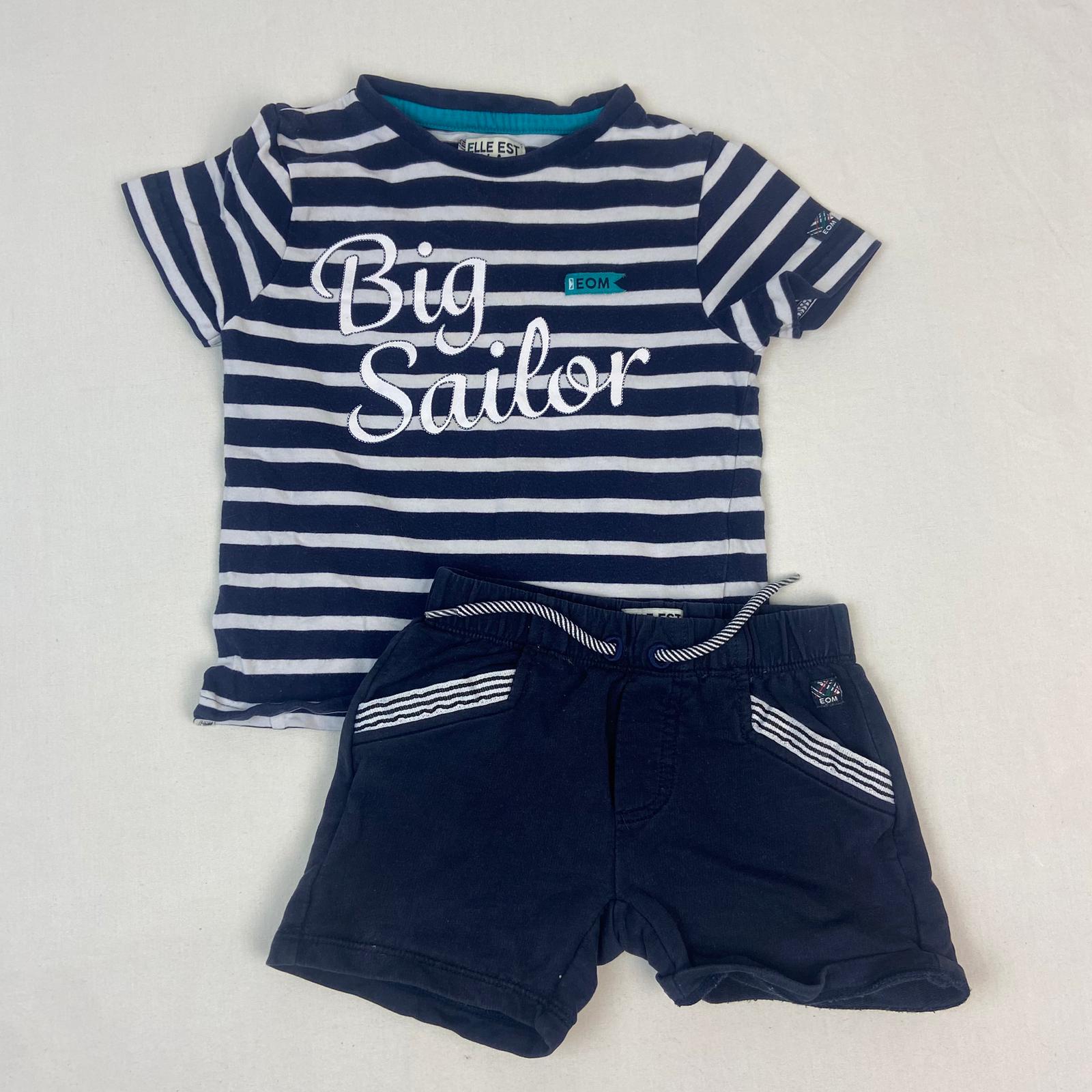 Autres commentaires : 3% élasthanne, T-shirt manches courtes bleu foncé et à rayures blanc, col rond, motif « BIG SAILOR ». Short bleu foncé 100% coton, taille élastiquée avec cordon.