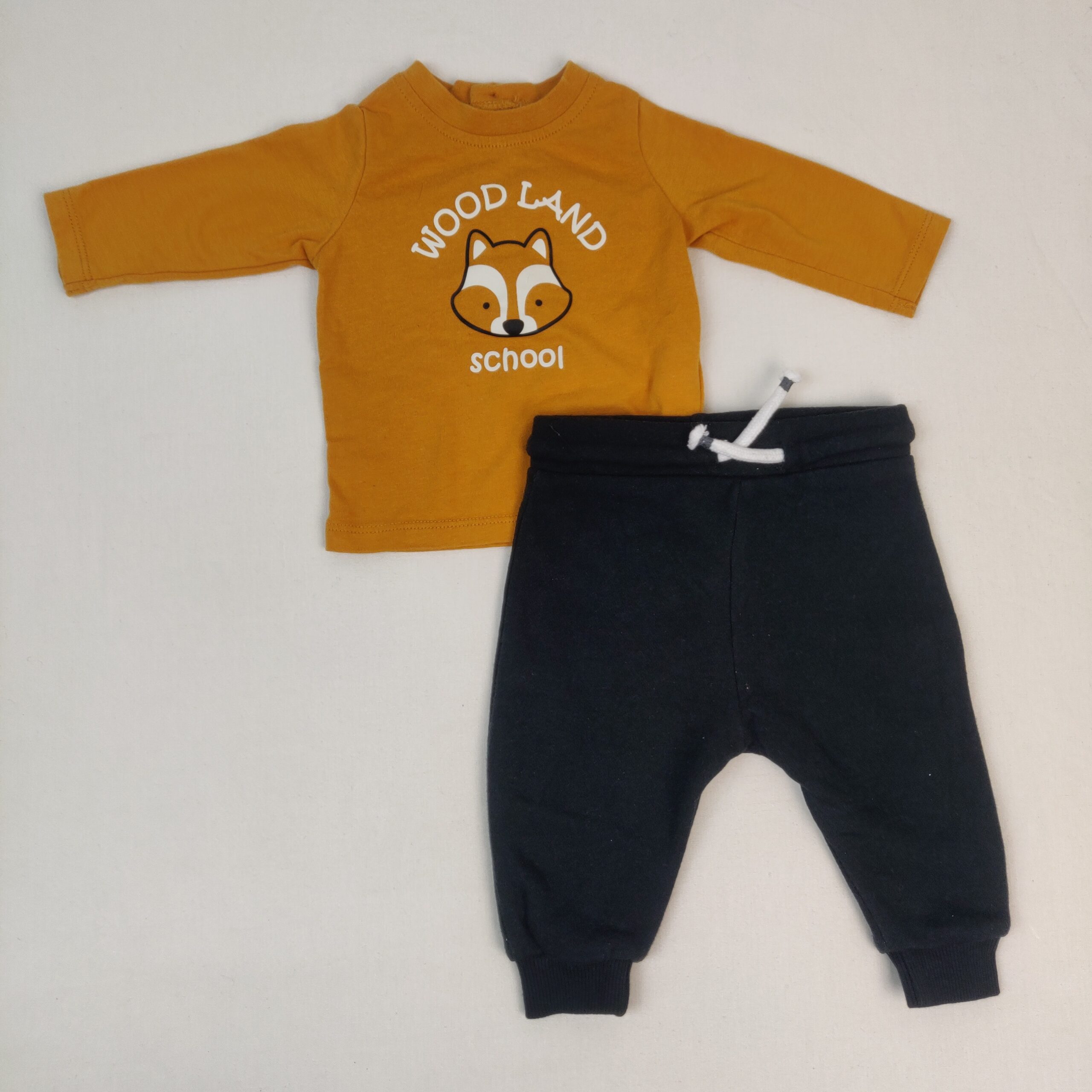 Autres commentaires : Ensemble 2 pièces dont – 1 t-shirt manches longues ocre, 60% coton et 40% polyester, col rond, motif renard et inscription « Wood land school », fermeture par boutons classiques en haut du dos, sans marque – 1 pantalon noir F&F, moletonné sur l’envers, taille élastiquée, 83% coton et 17% polyester.