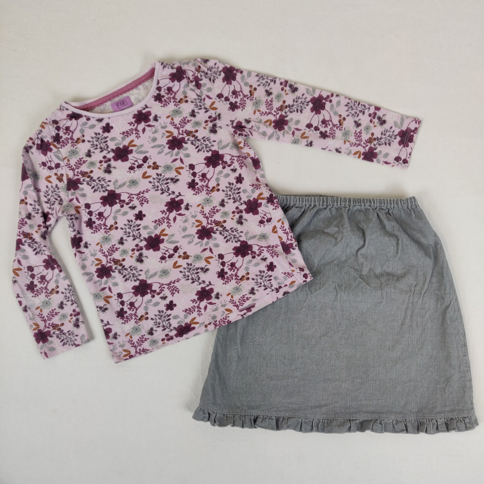 Autres commentaires : Ensemble 2 piéces : T-shirt rose , contient 97% de coton et 3% d’élasthane. Jupe courte gris élastiquée.