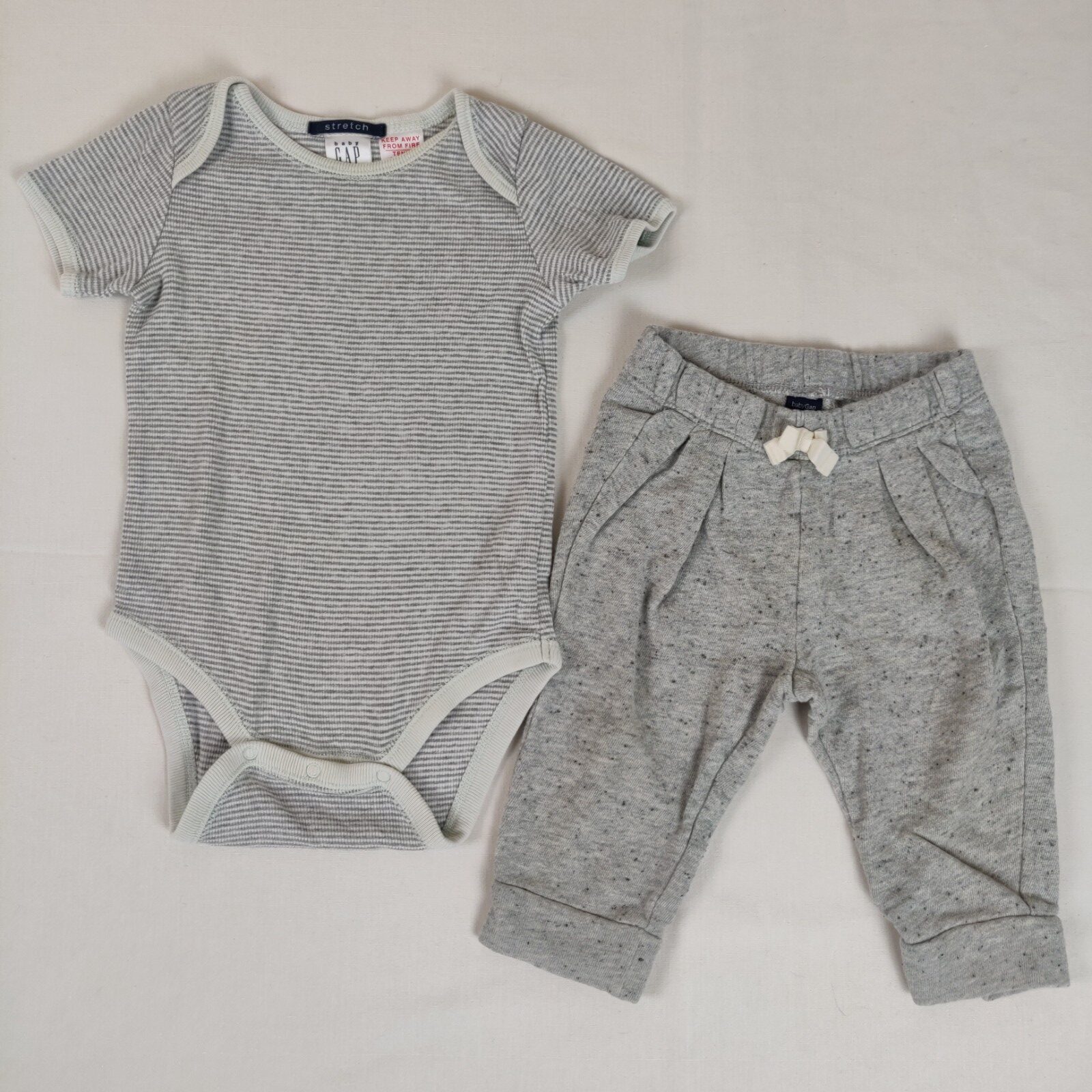 Autres commentaires : Ensemble 2 pièces. Body manches courtes (3% spandex) à fines rayures gris clair et gris foncé. Ouverture à l’entrejambe à 3 boutons pression. Pantalon de jogging (1% autres fibres) – gris clair moucheté. Taille élastique avec noeud écru décoratif.