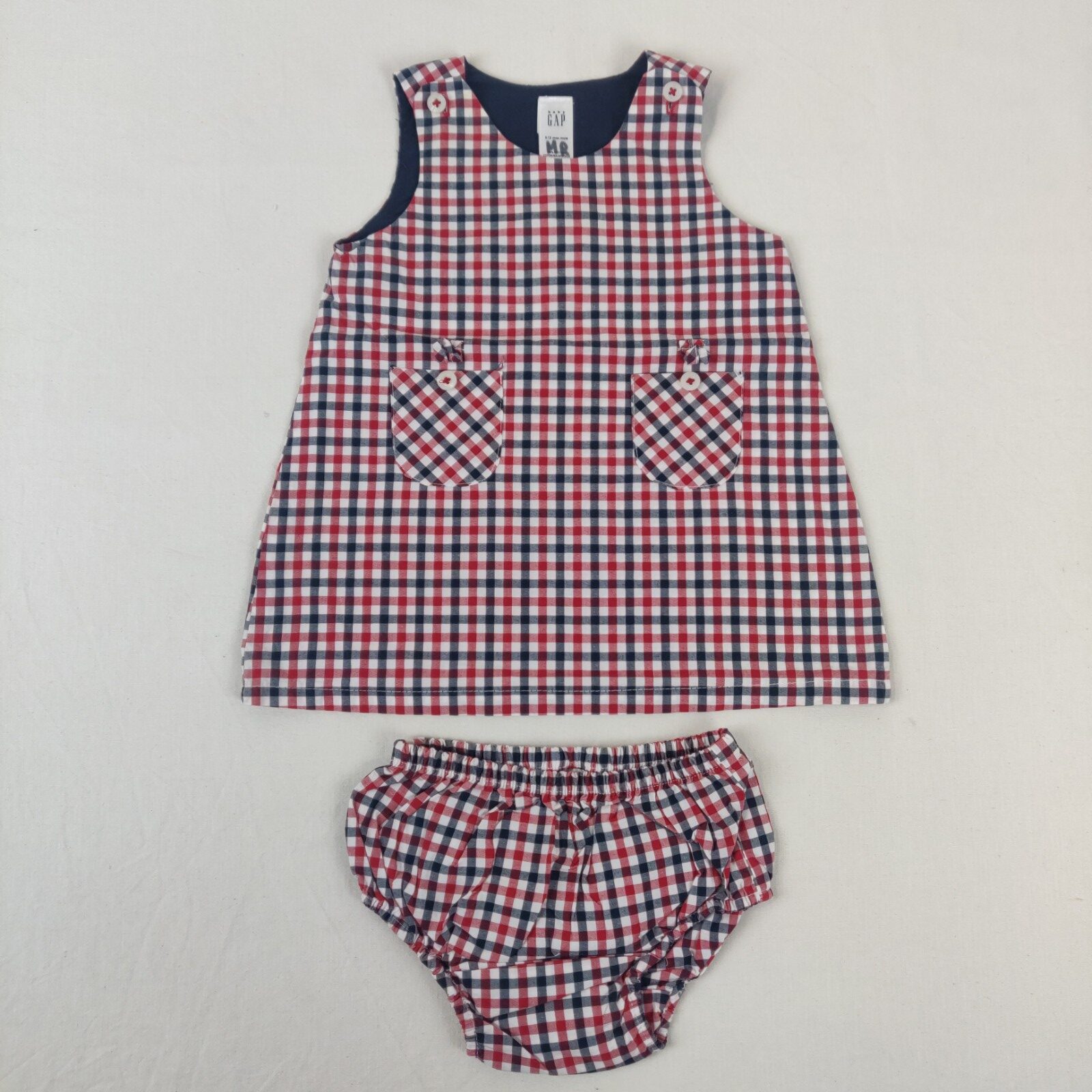Autres commentaires : Ensemble 2 pièces assorties. Une robe sans manche à motif Vichy bleu marine et rouge. Ouverture à un bouton au sommet des bretelles. 2 poches centrales. Un bloomer assorti. Taille élastique.