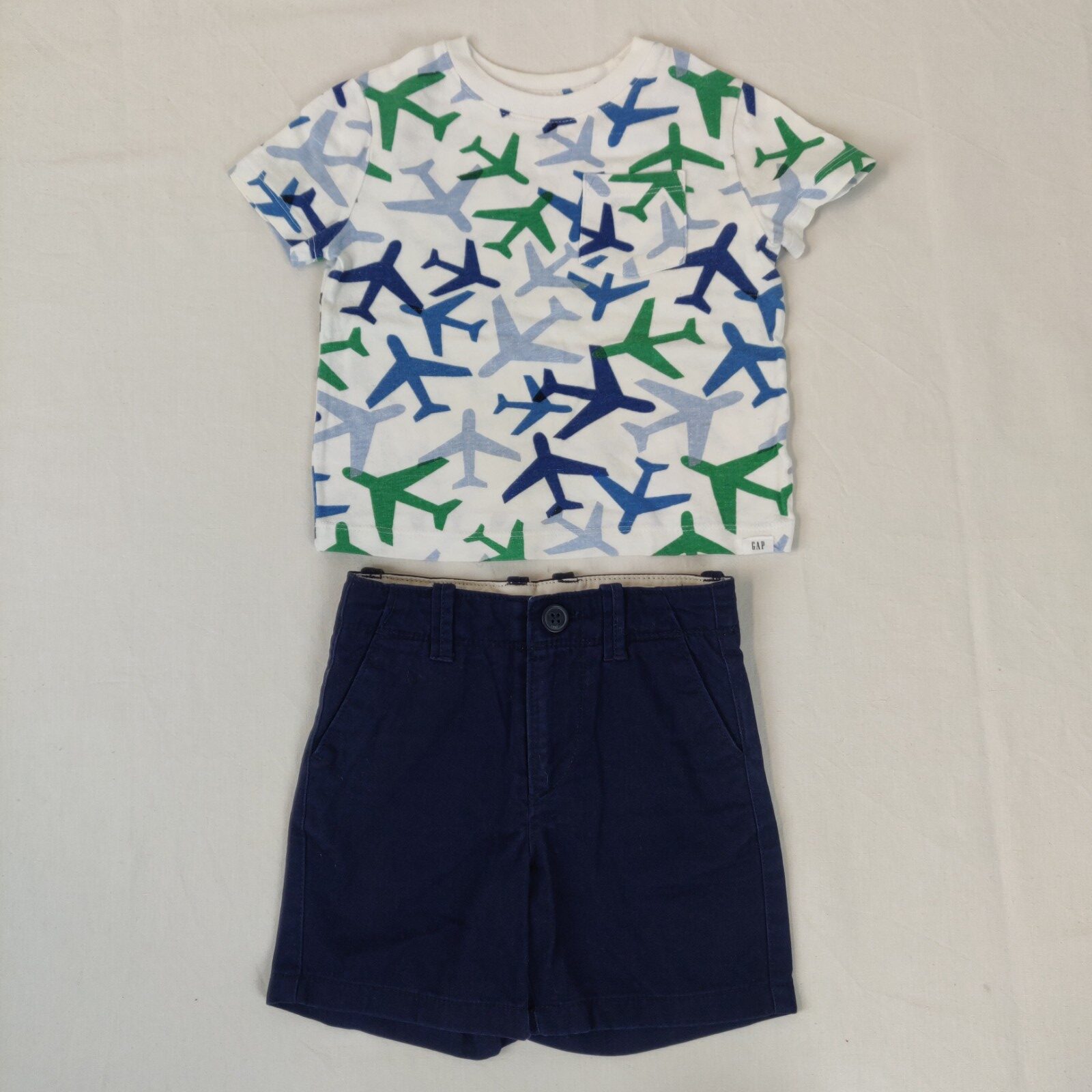 Autres commentaires : Ensemble 2 pièces. Un t-shirt à manches courtes – blanc à motifs avions bleus, bleu marine et verts. Une pochette centrale. Un bermuda – bleu marine. Taille ajustable. 2 poches latérales et 2 poches arrières. Passants pour une ceinture.