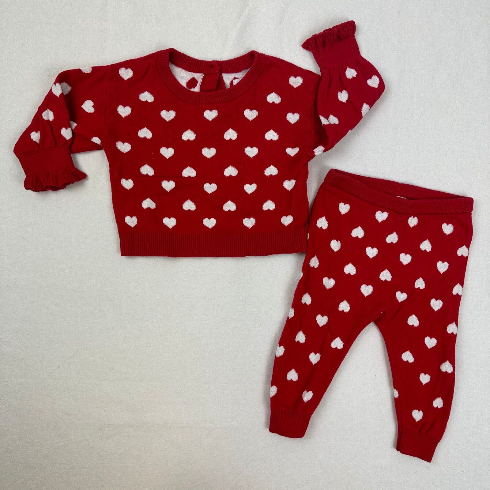 Autres commentaires : T-shirt manches longues rouge avec motif des coeurs et une fermeture au dos par boutons. Legging rouge avec taille élastiquée et le même motif.