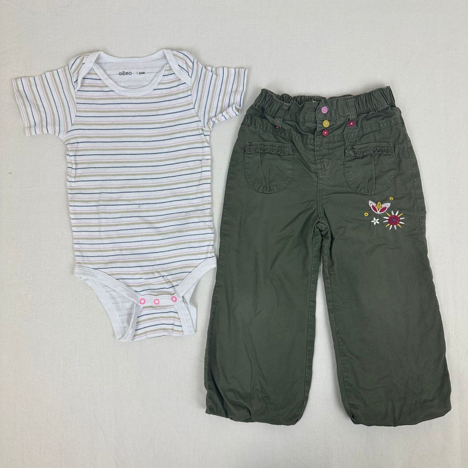 Autres commentaires : Pantalon vert avec taille élastiquée. Body blanc manches courtes à rayures vert,bleu et rose.