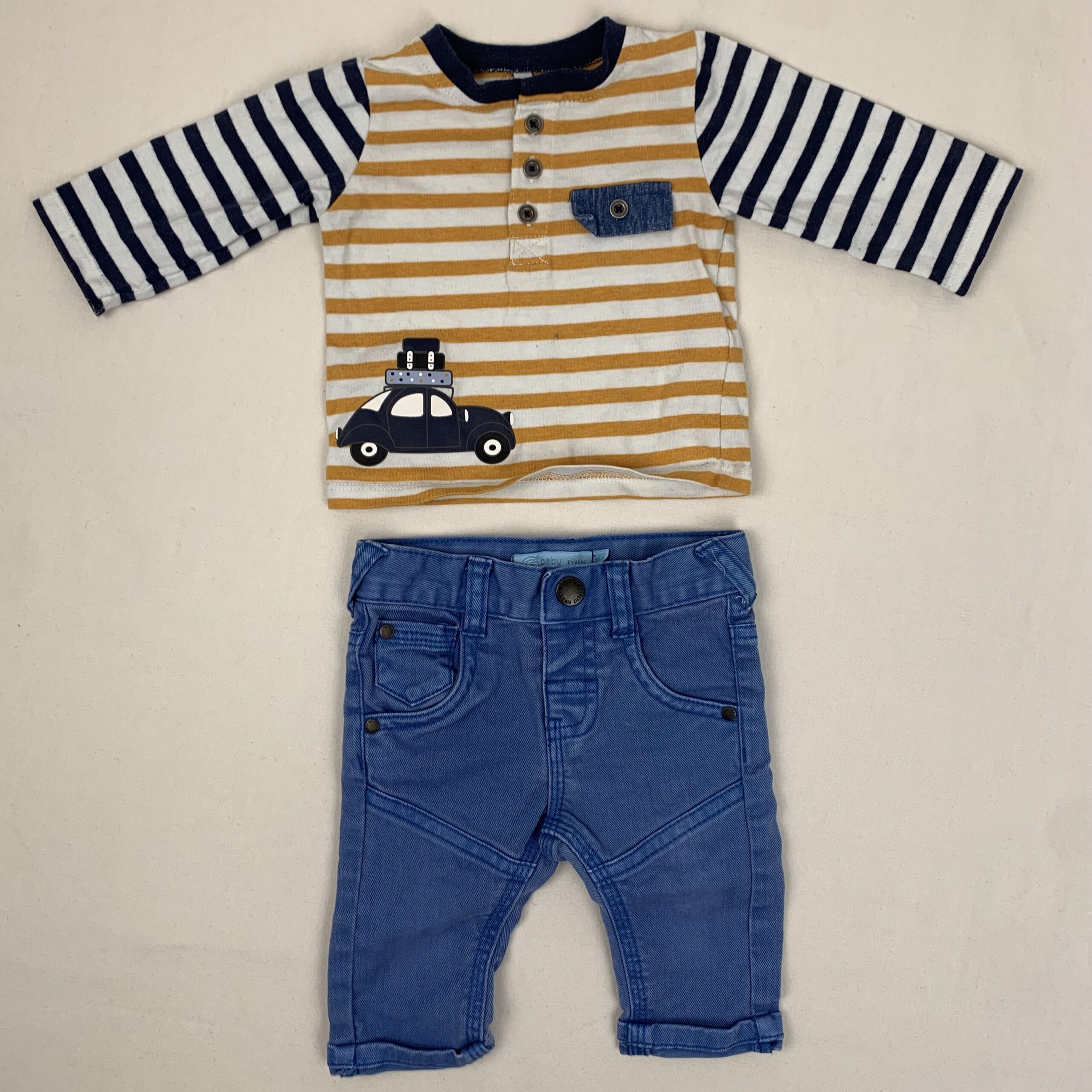 Autres commentaires : Ensemble 2 pièces 3M composé d’un T-shirt manches longues rayés motifs voiture et d’un pantalon bleu fermeture bouton pression et taille élastiquée réglable