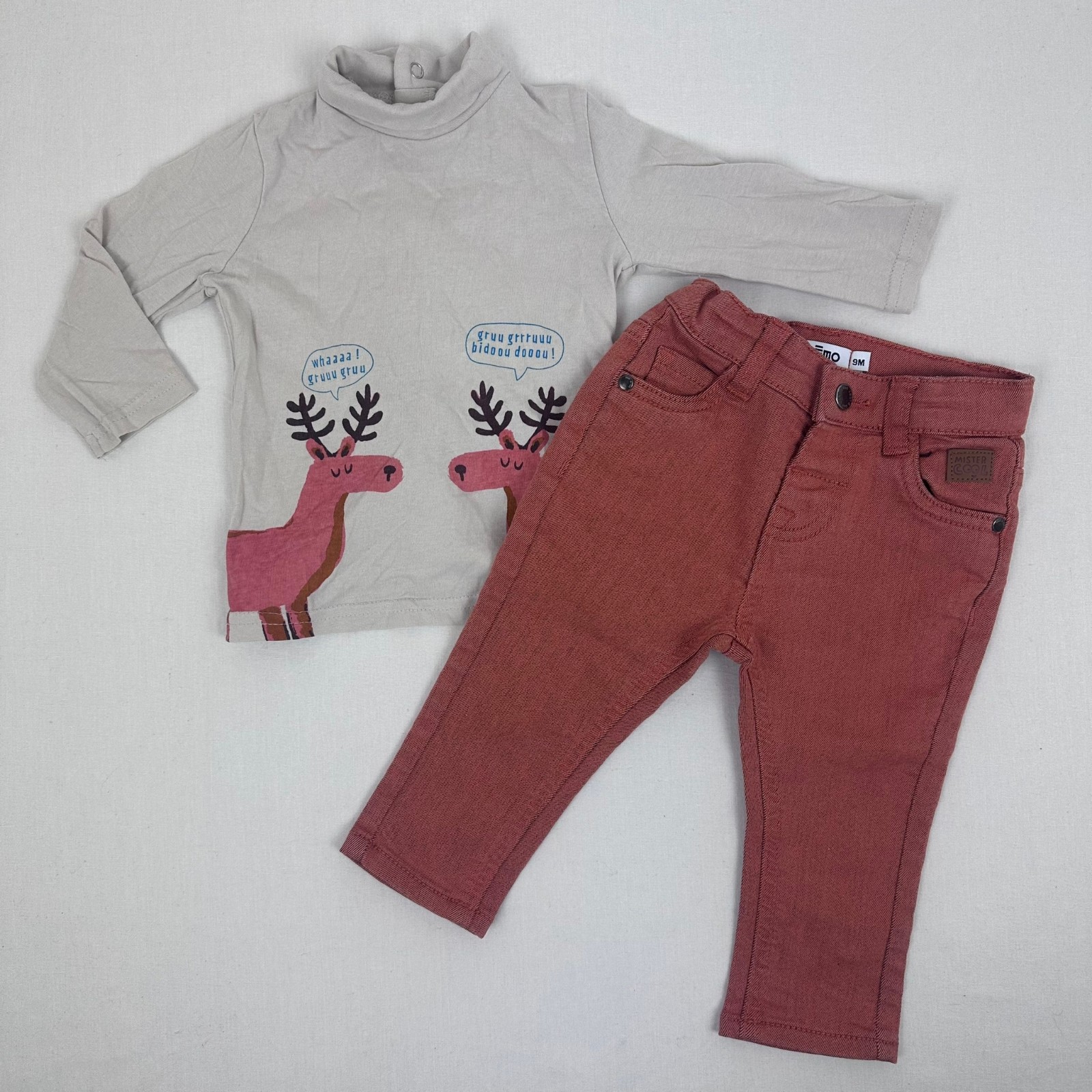 Autres commentaires : T-shirt beige manches longues, col roulé fermé tout au long du dos par des boutons de pression et contient 100% coton. Jean orange avec taille ceinturée et élastiquée. Contient 67% coton et 30% polyester.