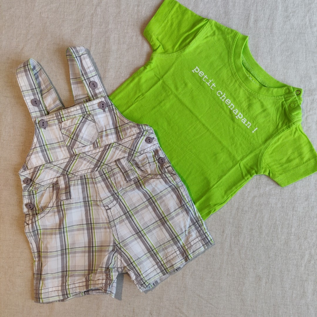 Autres commentaires : Salopette blanche motifs écossais gris et verts, fermetures côté et bretelles par boutons deux hauteurs, fermeture bas par boutons pression. T-shirt vert assorti, fermé par deux boutons pression au col, inscription « petit chenapan ! ».