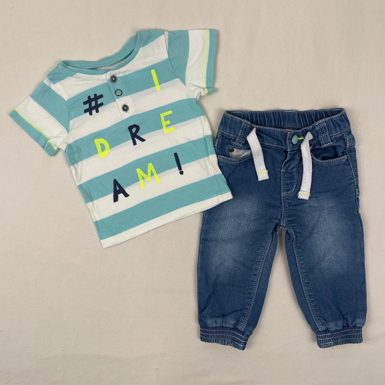 Autres commentaires : Joli ensemble deux pièces Grain de Blé : – T-shirt manches courtes, rayé bleu turquoise et blanc, 100 % coton, avec boutons pression au niveau du col teddy, pour un habillage facile. – Jean, confortable et souple (88 % coton, 11% polyester et 1 % élasthanne), taille élastiquée, fermeture devant par bouton pression.