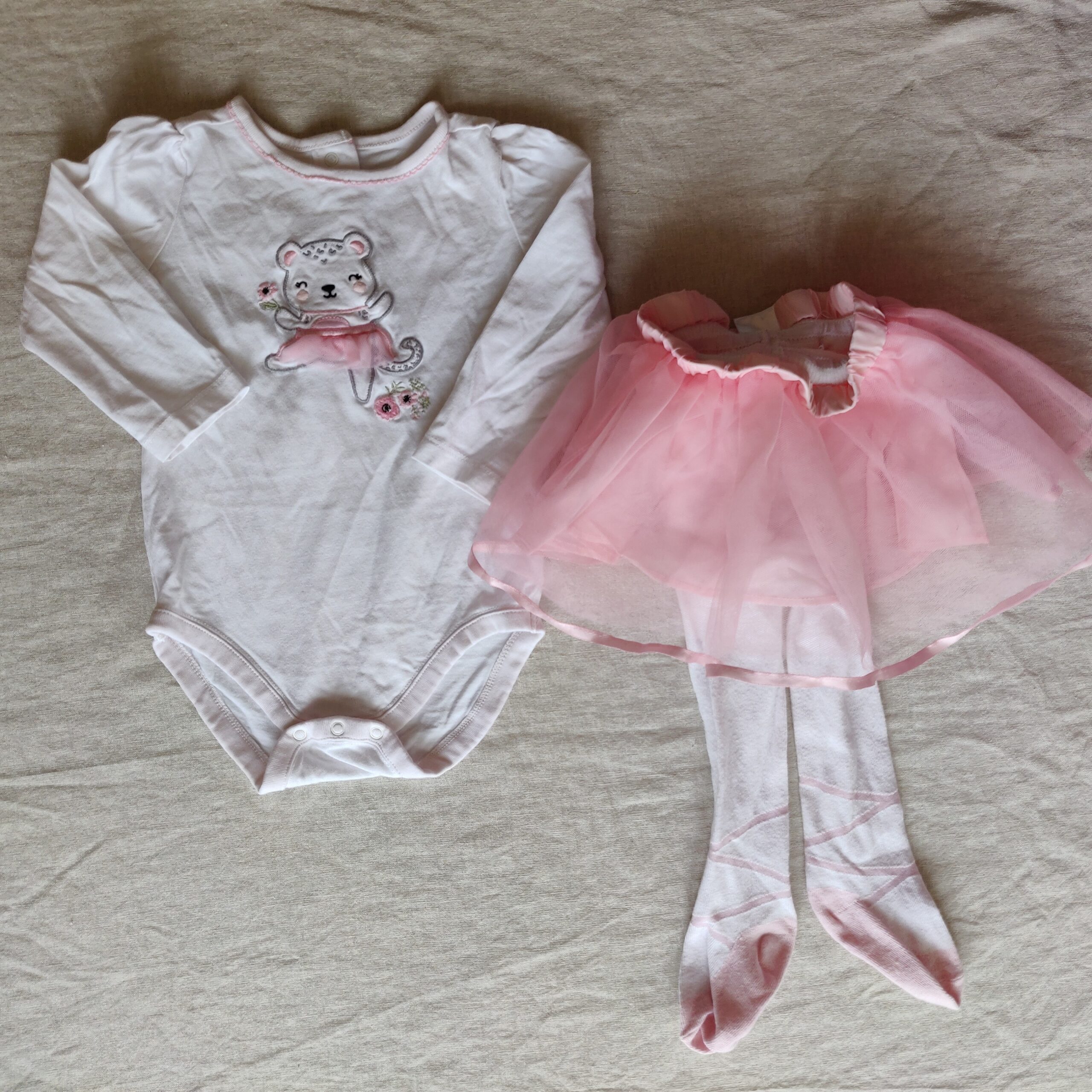 Autres commentaires : Ensemble body sur fond blanc et jupe tutu rose avec collant intégré. Motif ballerine