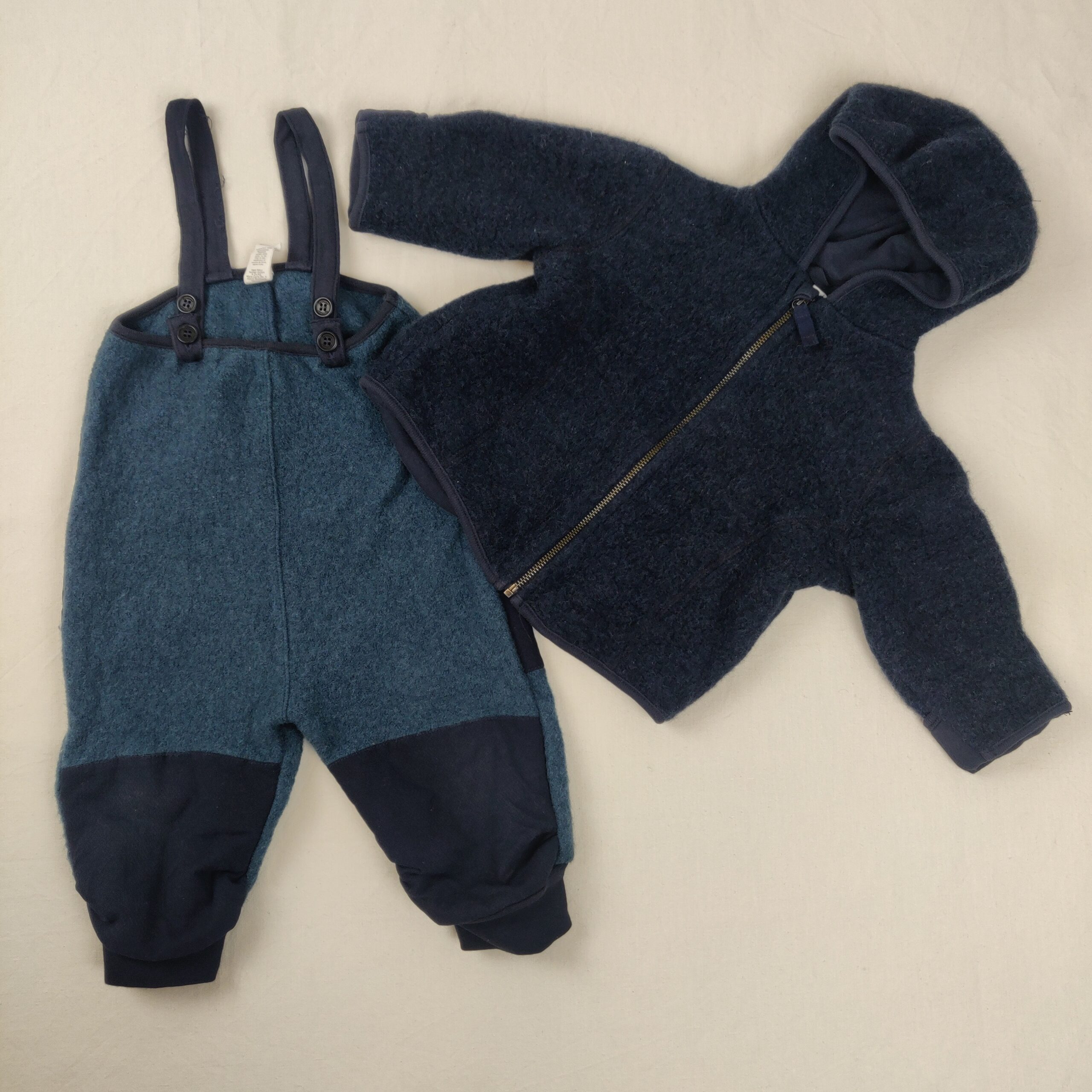 Autres commentaires : Veste à capuche bleu marine en laine vierge avec doublure jersey de coton et pantalon bleu marine en laine vierge avec bretelles et deux niveaux de fermeture à bouton.