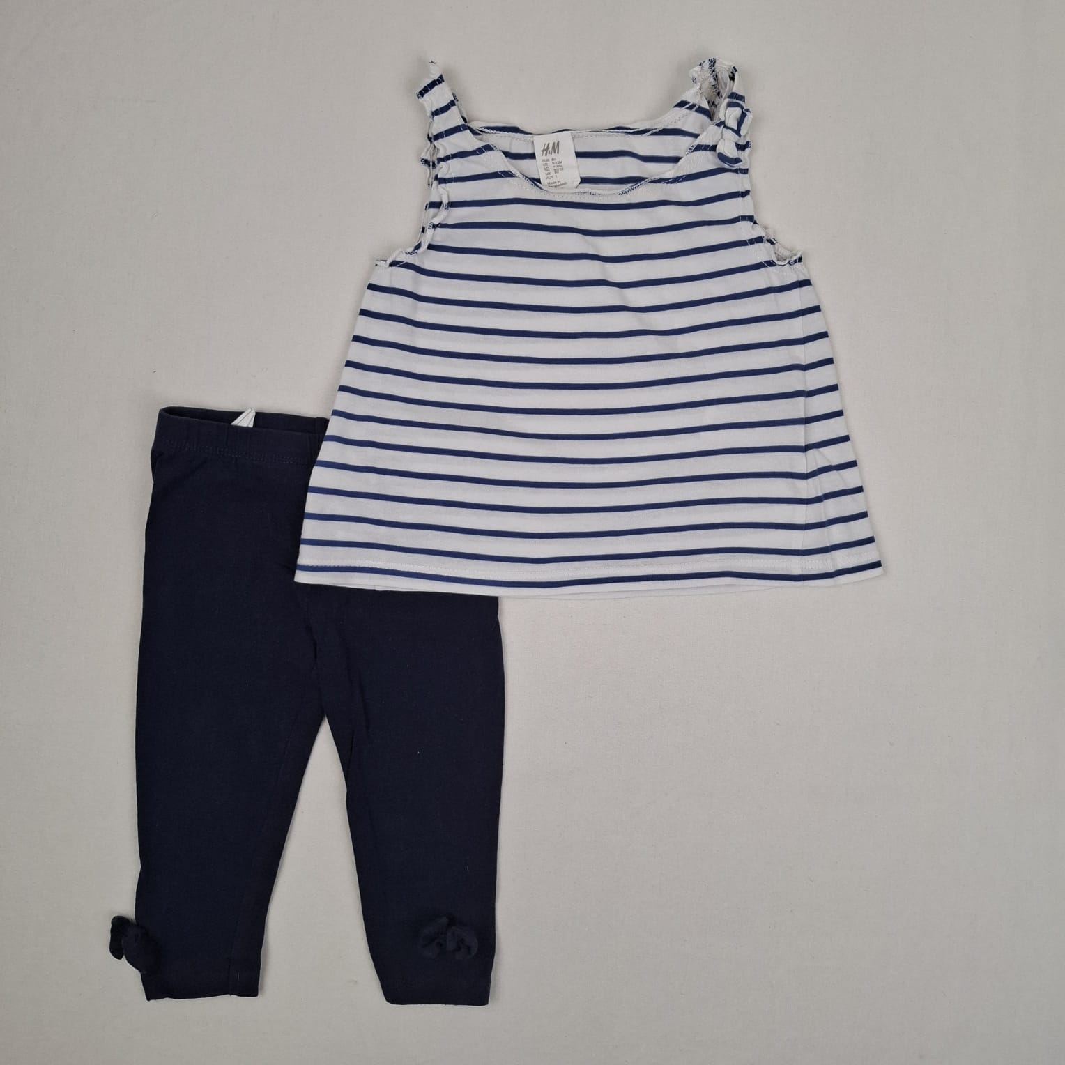 Autres commentaires : Ensemble 2 pièces H&M 12M composé d’un haut sans manche façon débardeur blanc rayés bleu et d’un bas long bleu marine taille élastiquée