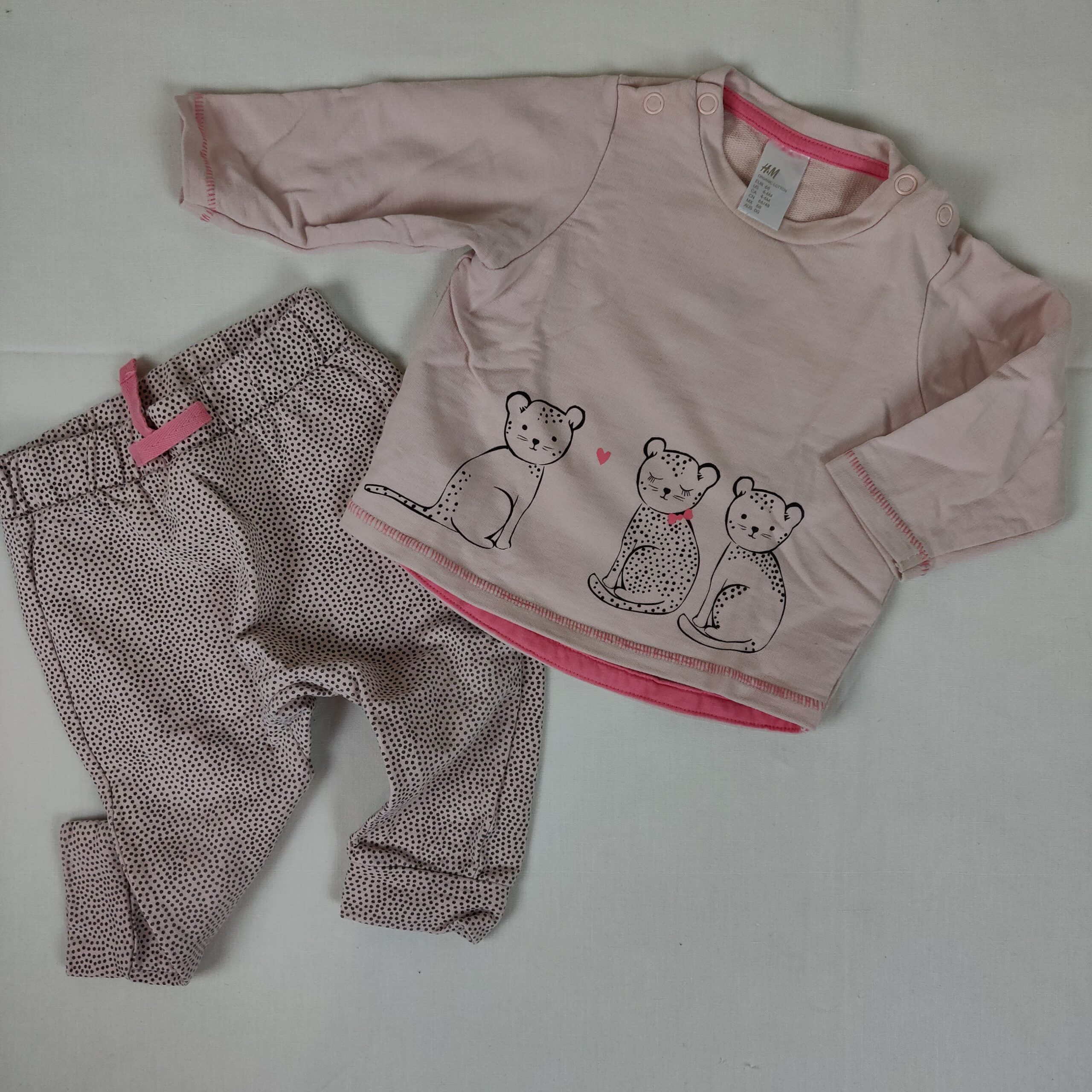 Autres commentaires : Coton biologique. T-shirt col rond vieux rose, motif 3 chats noirs à pois. Fermeture par 4 boutons pression aux épaules. Legging assorti, vieux rose ave pois noirs.