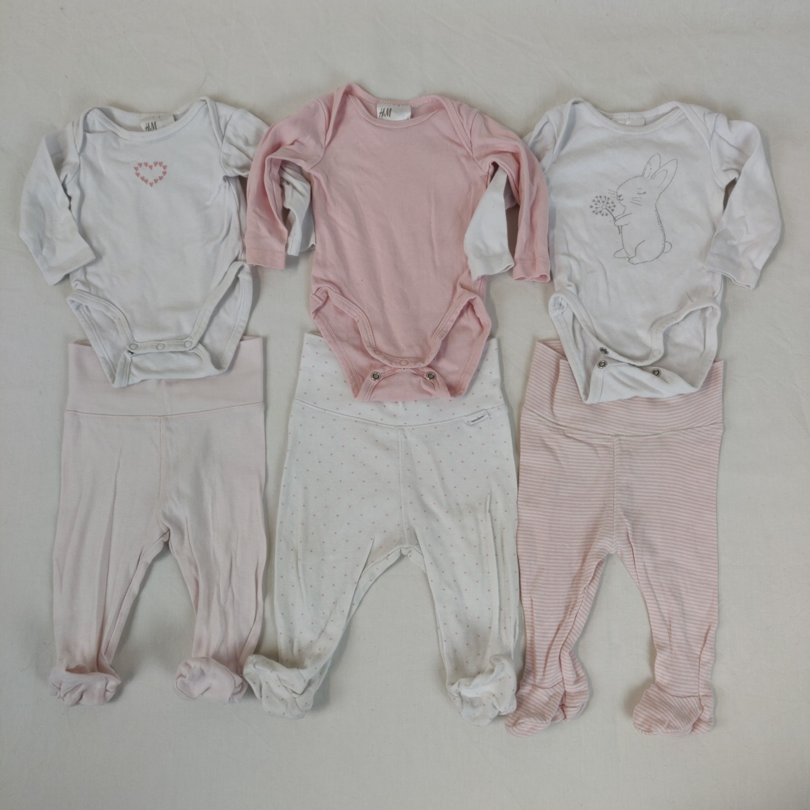 Autres commentaires : Lot de 3 ensembles 2 pièces composés d’un body manches longues et d’un collant à pieds. Premier ensemble : un body blanc à motif central coeur rose, un collant rose. Deuxième ensemble : Un body rose et un collant blanc à pois roses. Troisième ensemble : un body blanc avec motif lapin gris et un collant finement rayé rose et blanc. Usure normale des vêtements.