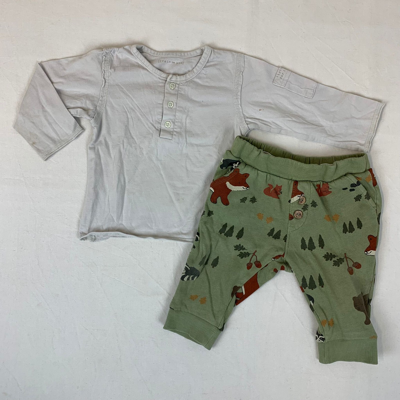 Autres commentaires : T-shirt manches longues beige sans marque avec une fermeture par devant. Pantalon jogging vert kaki avec taille élastiquée.